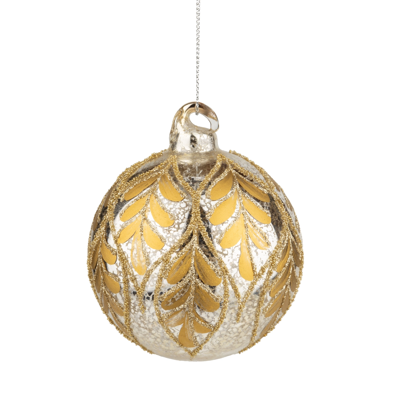 Clear glass ball with gold holly & glitter motif ornaments, 3 in. The price listed is PER item, with a minimum purchase quantity of 12 items. While we aim for consistency, there may be slight variations in color between the product and the images provided, as well as among individual items. However, we take steps to ensure that these differences remain minimal. MATERIAL: Glass