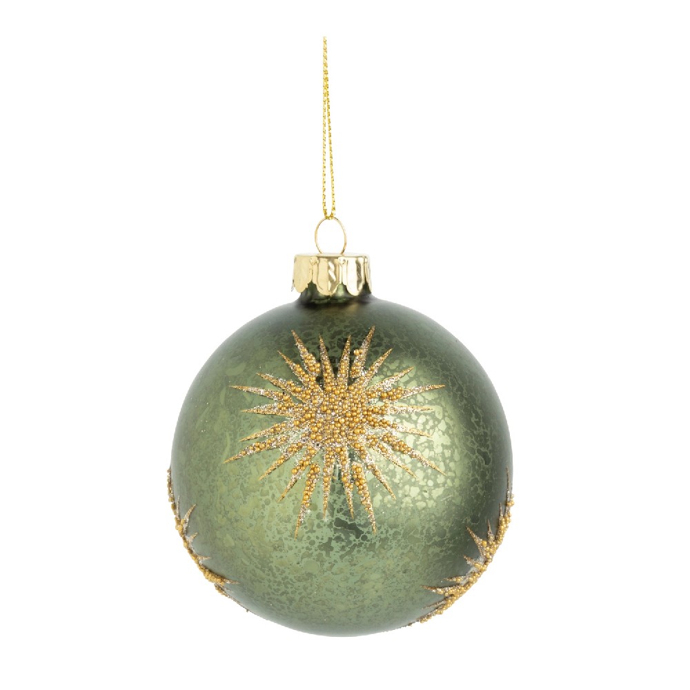 Glass ball ornament, antique green with gold bead and glitter starburst, 80mm/3 in -2024. The price listed is PER item, with a minimum purchase quantity of 12 items. While we aim for consistency, there may be slight variations in color between the product and the images provided, as well as among individual items. However, we take steps to ensure that these differences remain minimal. MATERIAL: