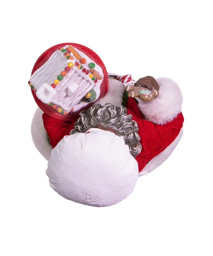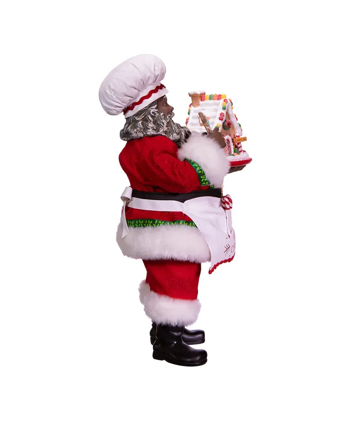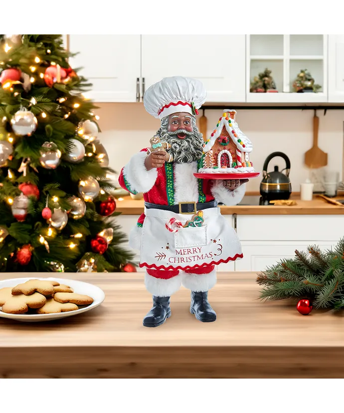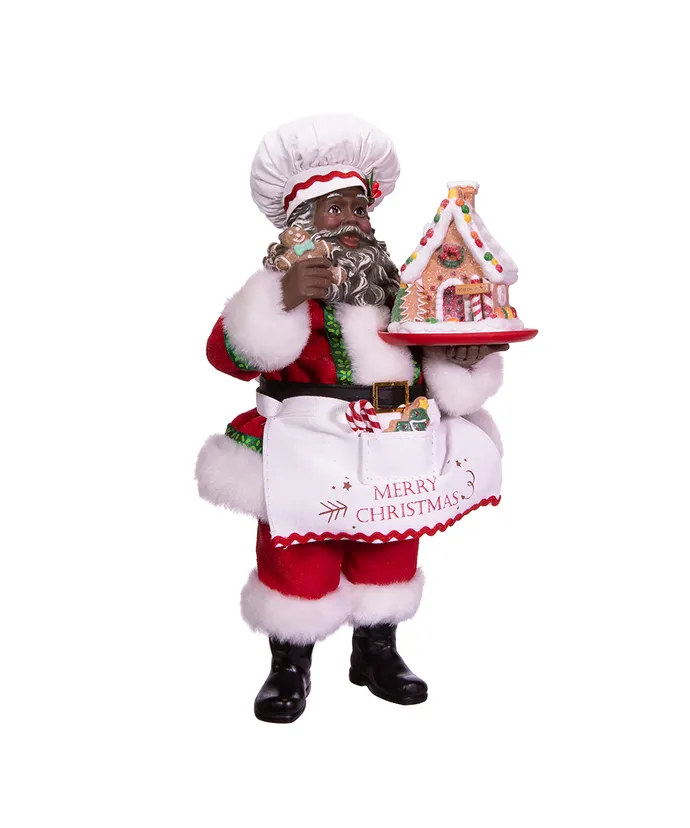 Celebrate the baker in your life with this Kurt Adler Fabriche African American Gingerbread Chef Santa! This 10-5″ Santa features Santa wearing an “Merry Christmas” apron decorated with red trim and a matching chef’s hat- Santa is carrying a decorated gingerbread house in one hand and gingerbread cookie in the other hand-