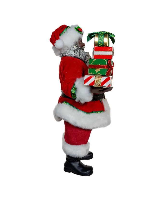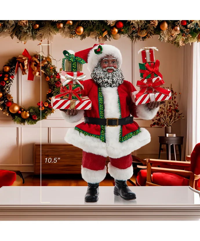 Kurt Adler’s 10-5″ Fabriche African American Santa with Gifts is a heartwarming and festive figurine that brings diversity and holiday spirit to your seasonal decor- This meticulously crafted figurine stands at 10-5 inches tall and features a jolly African American Santa Claus holding a stack of beautifully wrapped gifts in each hand- The Fabriche collection is known for its attention to detail and high-quality craftsmanship and this Santa figurine is no exception- The figure is made from a combination of fabric and other materials creating a soft and textured appearance that adds warmth to your holiday display- Santa’s joyful expression rich red suit and the intricately detailed gifts in his sack contribute to the overall charm of the figurine- The inclusion of an African American Santa adds cultural diversity to your Christmas decor making it a thoughtful and inclusive addition to your holiday collection- This figurine is the perfect size for tabletops mantels or shelves making it easy to incorporate into various areas of your home- Whether displayed on its own or as part of a larger holiday scene the 10-5″ Fabriche African American Santa with Gifts is sure to bring smiles and festive cheer to your space during the holiday season-