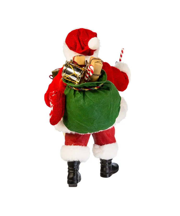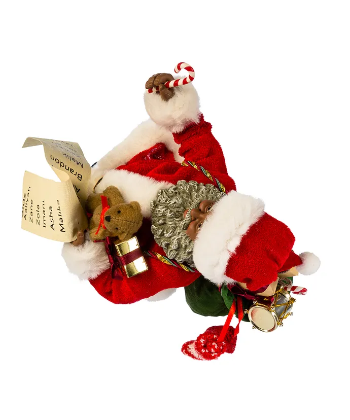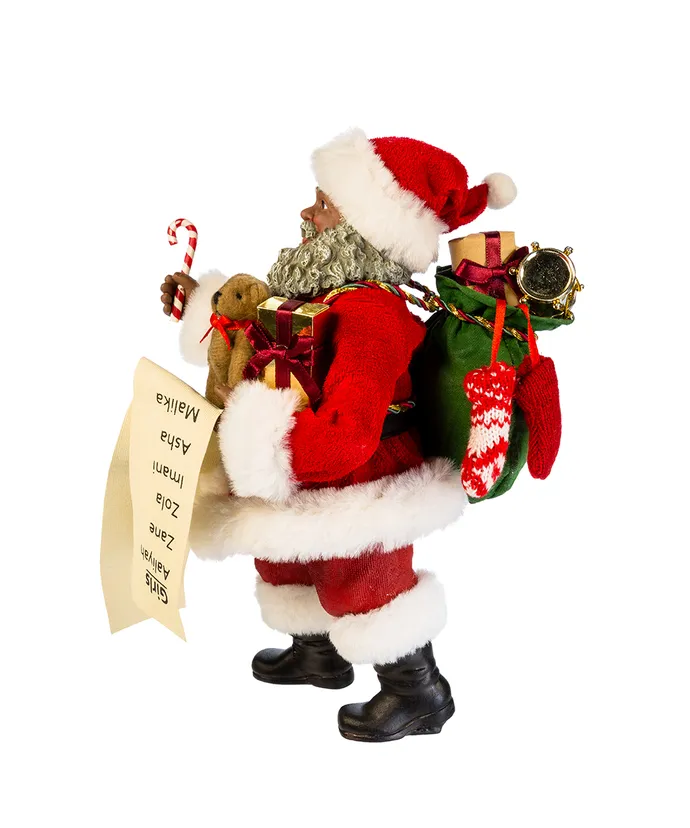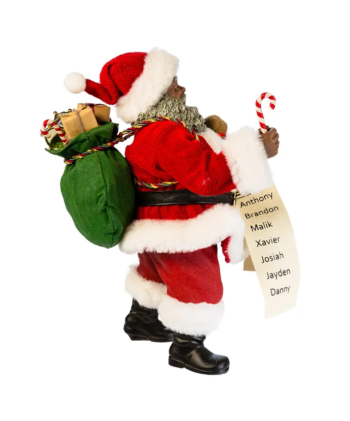 Part of Kurt Adler’s Fabriche collection this 10-5″ Fabriche African American Santa with list and candy cane is a fun and festive addition to any holiday decor- Santa Claus is featured here wearing the traditional red and white suit- He has a large bag of gifts on his back the naughty and nice list in one hand and a candy cane in the other hand-