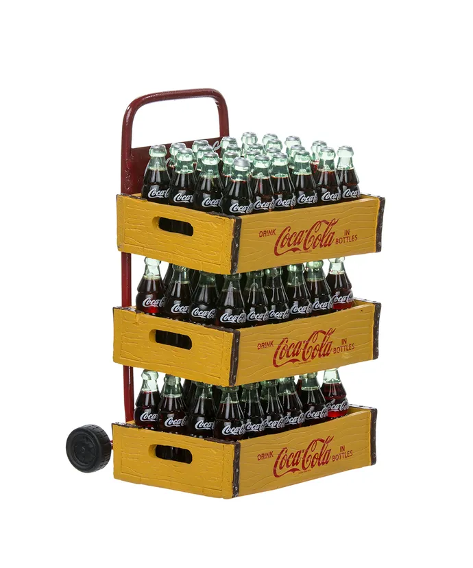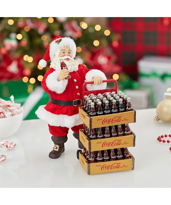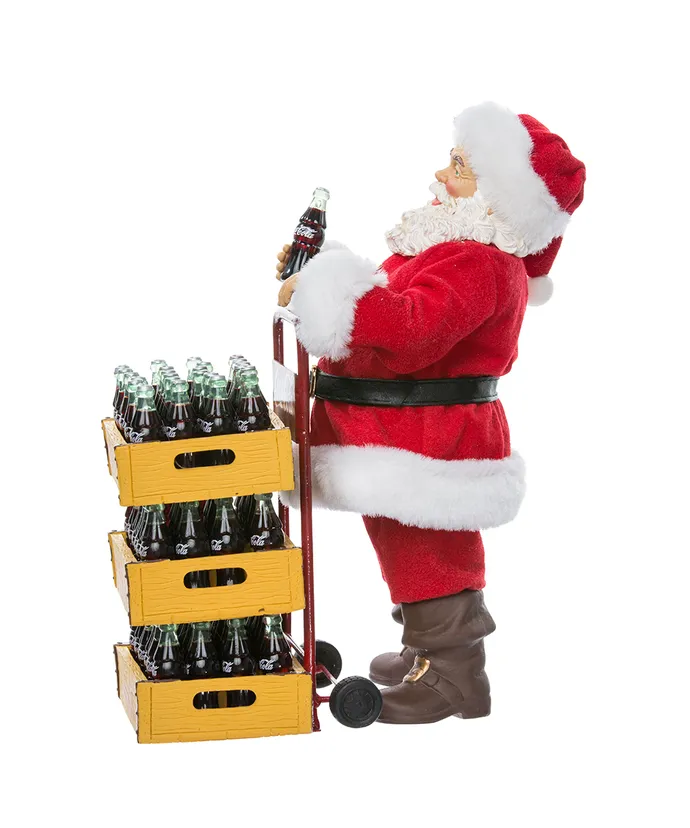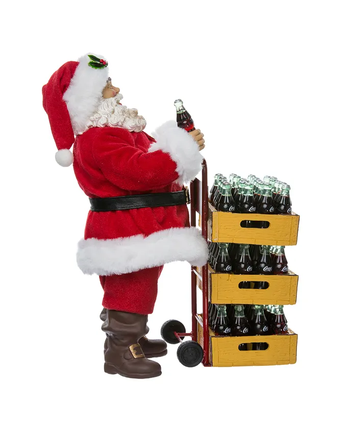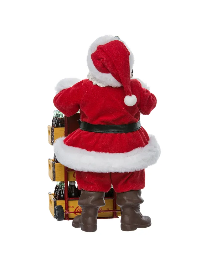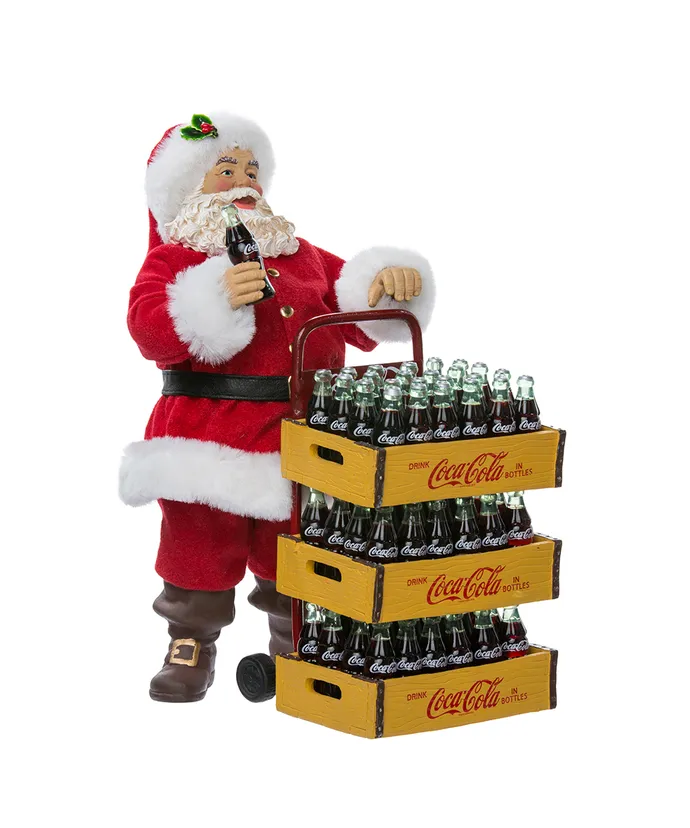 Add a touch of nostalgia to your holiday decor with this Coca-Cola Santa with delivery cart set of two pieces from Kurt Adler- Santa Claus is featured in his signature red and white suit holding a bottle of Coca-Cola in his hand- Included in Santa’s cart are three large cases of Coca-Cola bottles-