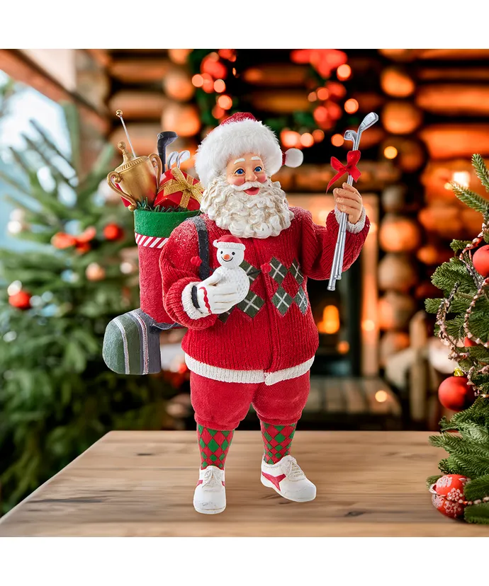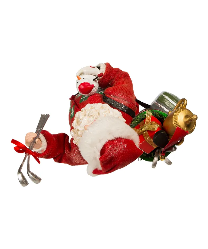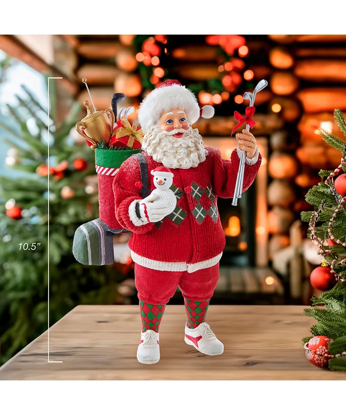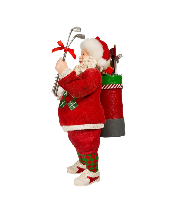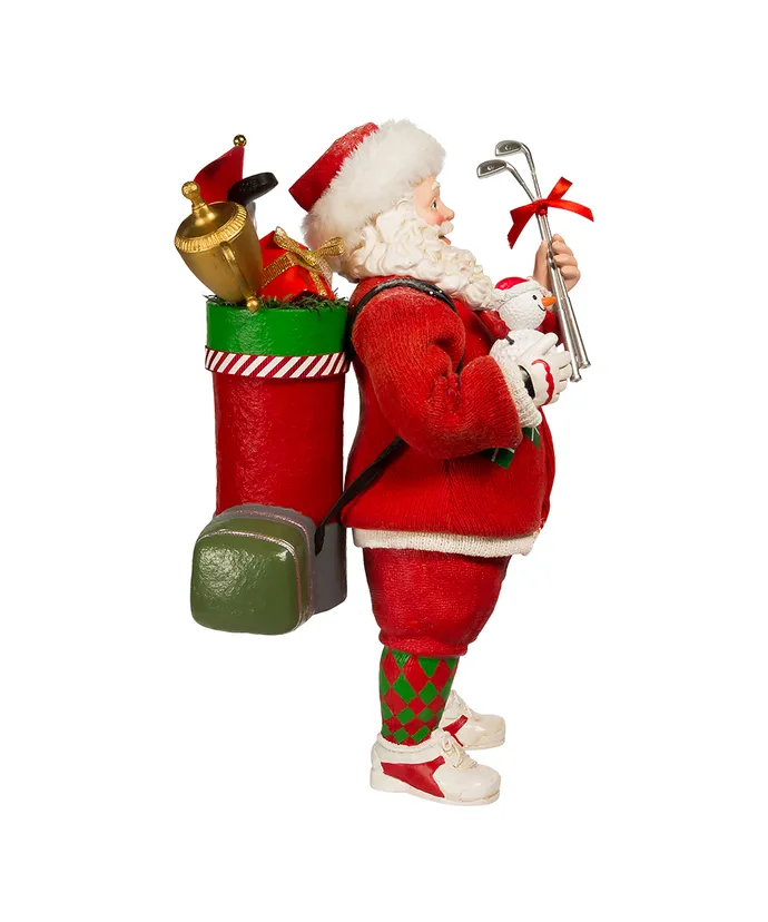 Celebrate the golfer in your life with this Kurt Adler Fabriche Golf Santa! This 10-5″ table piece features Santa wearing a red green and white argyle sweater with red shorts and argyle style knee high socks- He has a golf club bag filled with presents and gifts on one shoulder and is holding a golf ball snowman in one hand and in the other hand he is holding silver golf clubs-