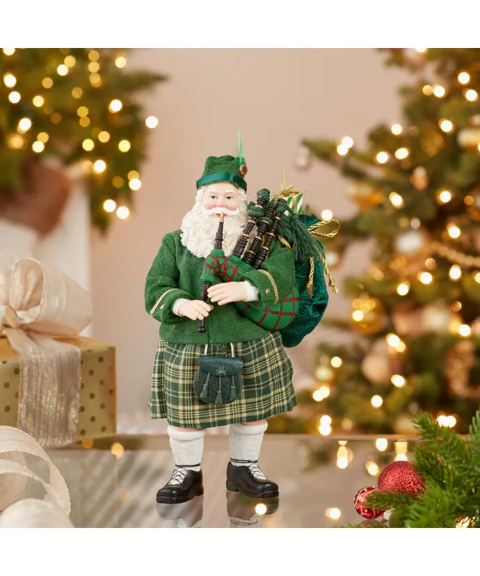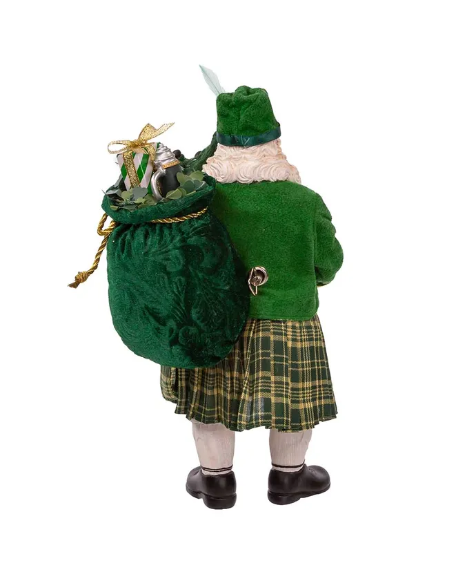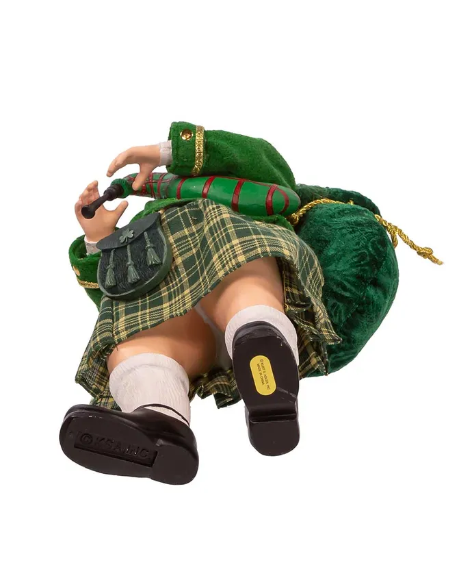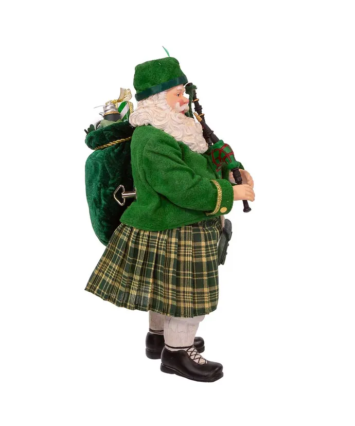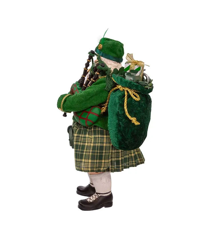 Part of Kurt Adler’s Fabriche collection the 10-5″ Fabriche Musical Irish Bagpiper Santa is a festive and unique holiday decoration featuring a Santa Claus figure dressed as an Irish bagpiper- The Santa figure is made of a fabric material giving it a soft and detailed appearance- He is dressed in a traditional Irish kilt complete with a red and green bagpipe- The figure stands at 10-5″ tall making it the perfect size for display on a mantel tabletop or shelf- This charming decoration plays the tune “When Irish Eyes are Smiling” when activated- It would make a great addition to an Irish-themed holiday display-