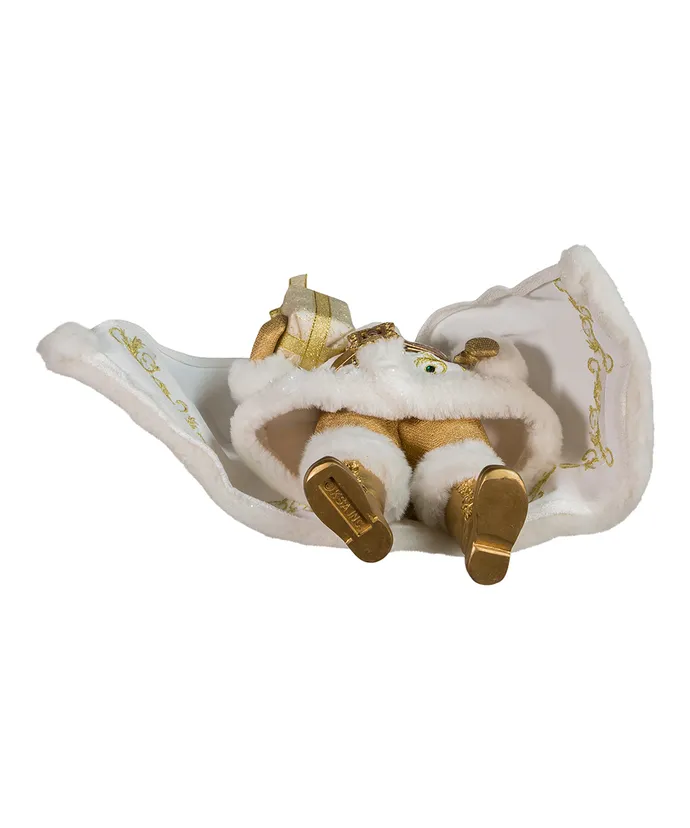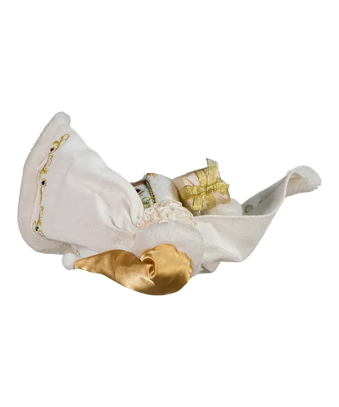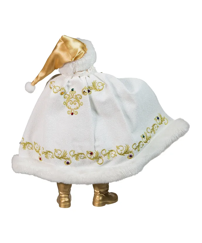 This 10-5″ Fabriche white and gold Santa is a fun and festive addition to your holiday decor or collection- Santa is wearing a multicolored jeweled white and gold outfit with gold boots and matching Santa Hat- He is holding a decorated white and gold gift box-