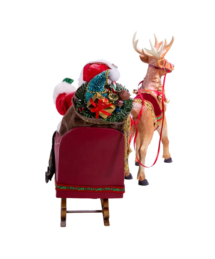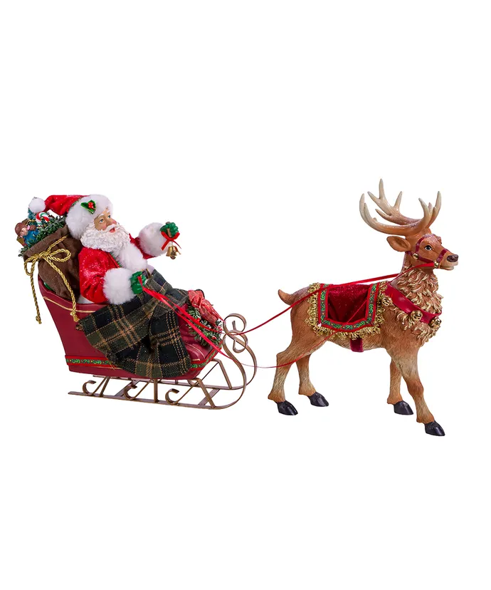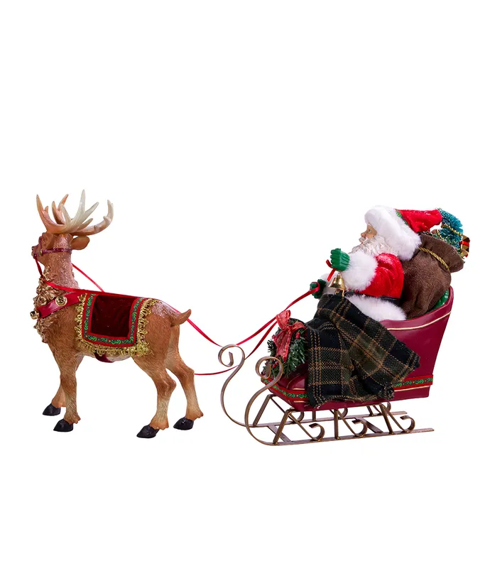 This Kurt Adler 10″ Fabriche Santa in sleigh with deer is a fun festive way to add to your holiday decor- This Santa is snug and warm under a plaid blanket in his beautifully detailed red sleigh; he is wearing his classic red and white suit and carrying in his sleigh a large bag full of gifts- He is being pulled by one of his reindeer which is adorned with red harnesses a red blanket and jingle bells- This piece is sure to be a treasured part of your holiday decor for years to come-