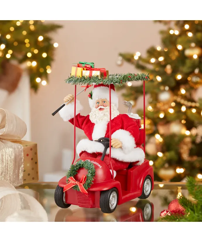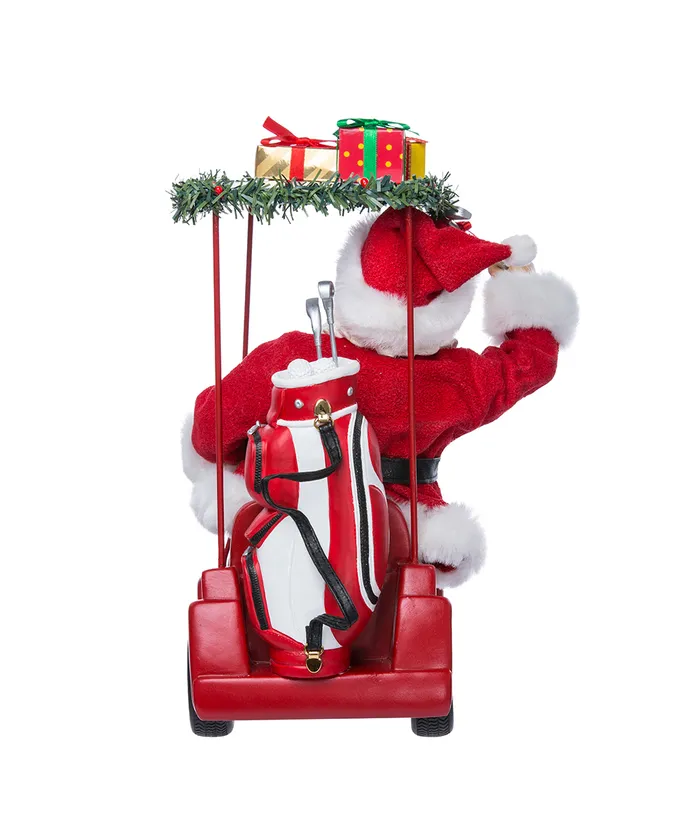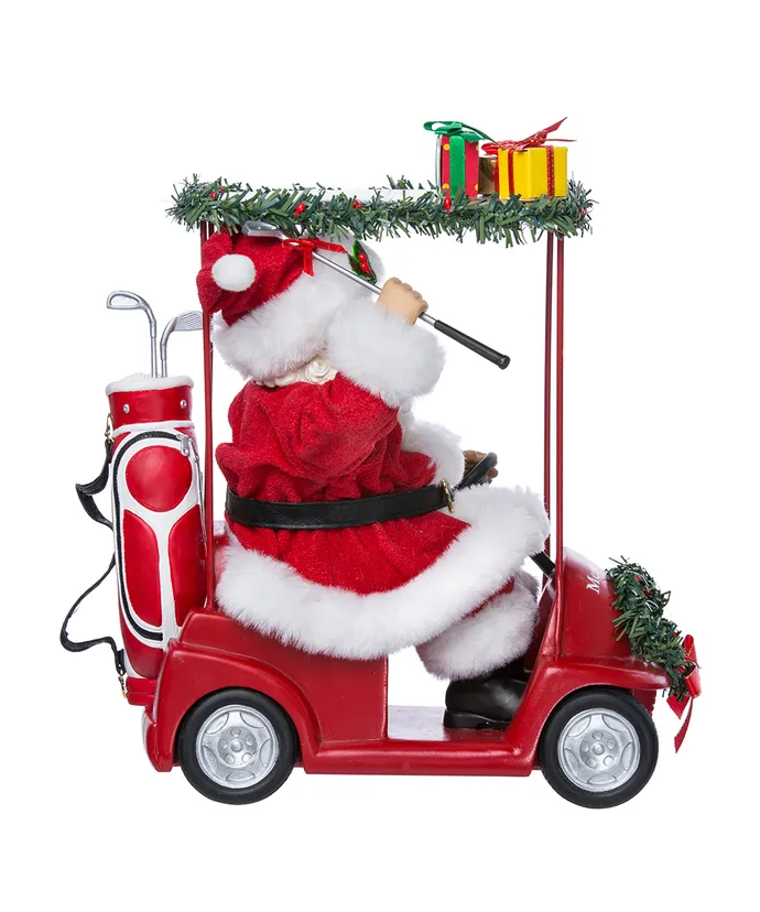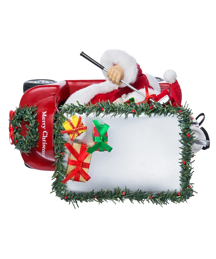 Part of Kurt Adler’s Fabriche collection this 11-25″ Fabriche Santa driving golf cart from Kurt Adler is a fun and festive addition to any holiday decor- Perfect for golf fans Santa Claus is featured here wearing his traditional red and white hat and suit- He is sitting in a red golf cart that reads “Merry Christmas” and is decorated with presents garland and a wreath for an extra festive touch-