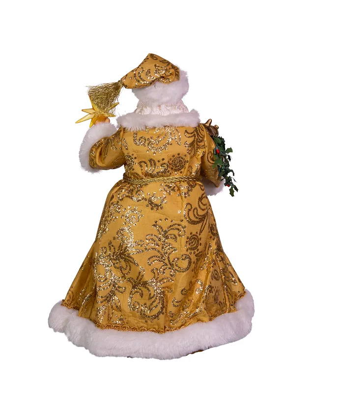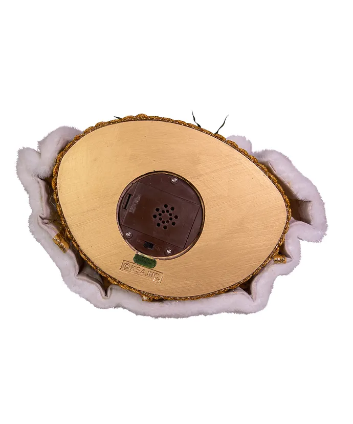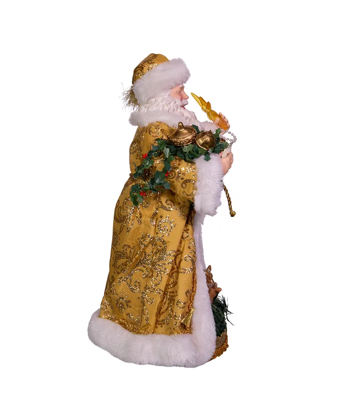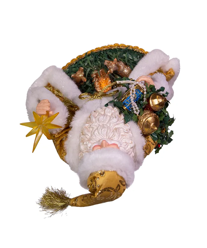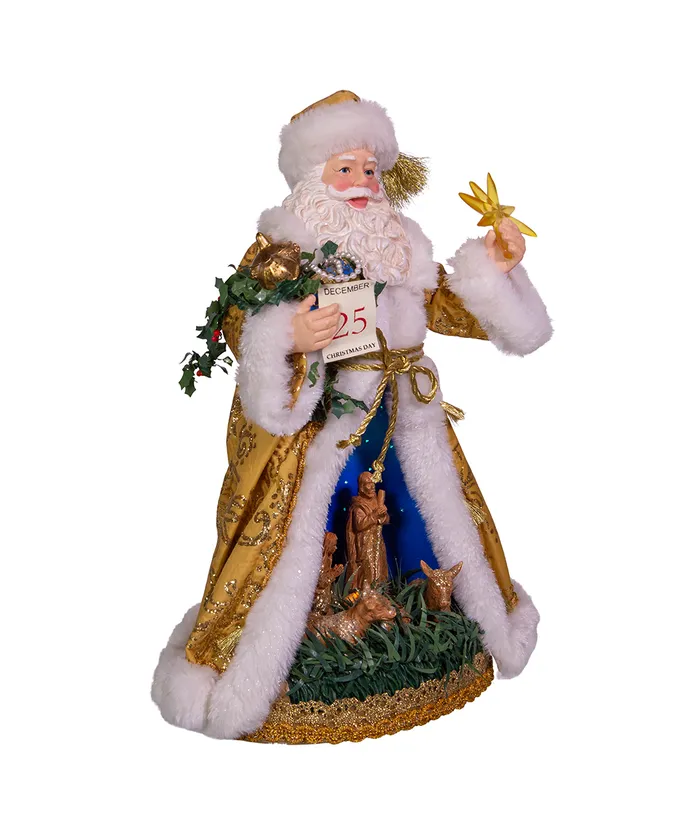 This 11-5″ Fabriche battery-operated LED nativity Santa from Kurt Adler is a stunning addition to any holiday decor- Santa is wearing a gold robe decorated with gold glitter and is holding a Bethlehem star in one hand and a calendar date in the other- A Nativity scene is lit from within at the bottom of his robe-
