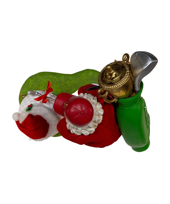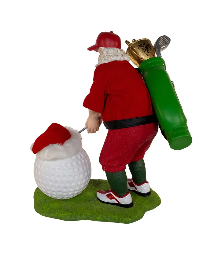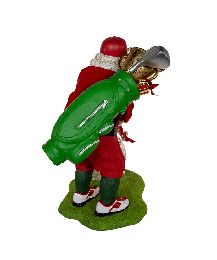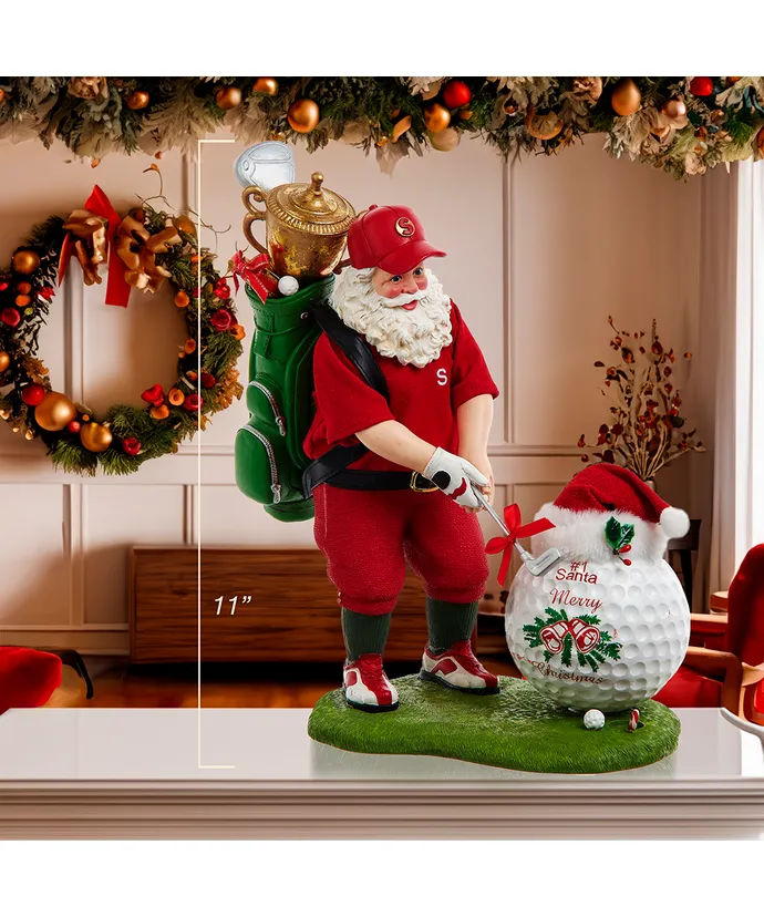 Kurt Adler’s 11″ Fabriche Golfer Santa With Oversized Golf Ball a charming and sporty addition to your holiday decor that combines the beloved traditions of Santa Claus with the enthusiasm for golf- Crafted with meticulous attention to detail this unique figurine celebrates the joy of the game and the festive spirit of the holiday season- Standing at a delightful 11 inches tall this Fabriche figurine features Santa Claus dressed in a red golf outfit with a red cap but with a playful twist- Santa is captured mid-swing with a golf club in hand ready to take a shot with an oversized golf ball that’s nearly as big as he is- His cheerful facial expression and dynamic pose capture the excitement and spirit of the golf course- Place this table piece on your mantel tabletop or as a centerpiece in your holiday display to celebrate the love of golf and the playful side of Santa Claus- Whether you’re an avid golfer or simply want to add a touch of sporty fun to your holiday decorations this figurine is a lighthearted reminder of the joy of the game and the spirit of the season-