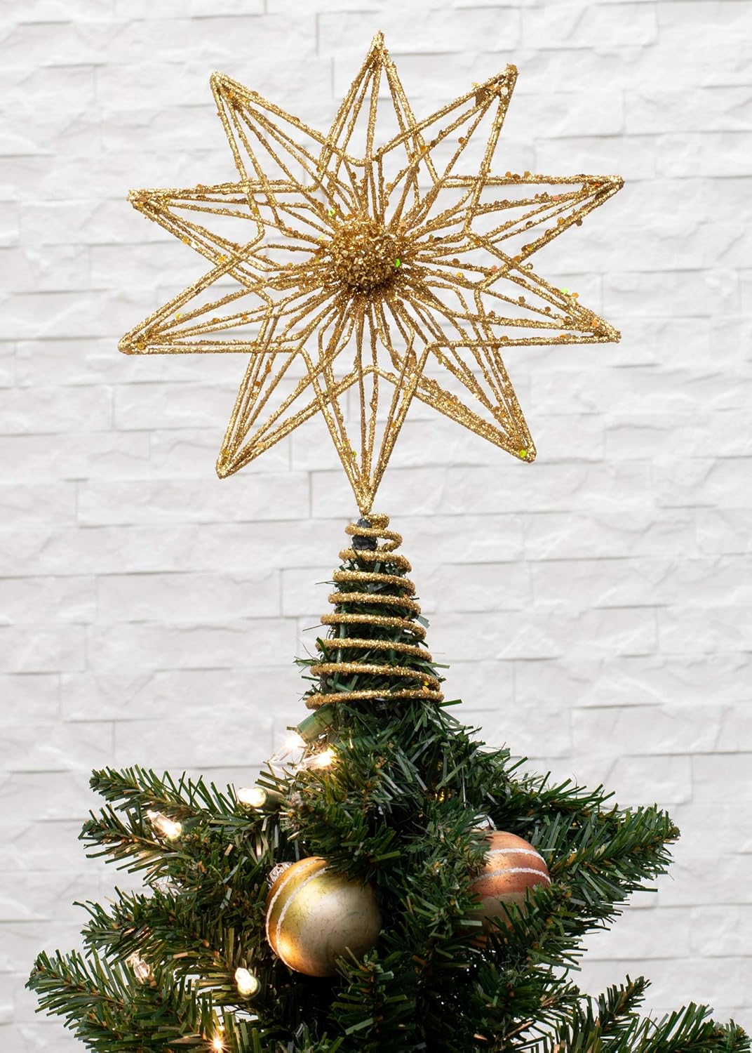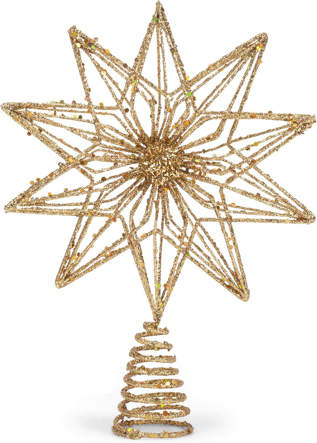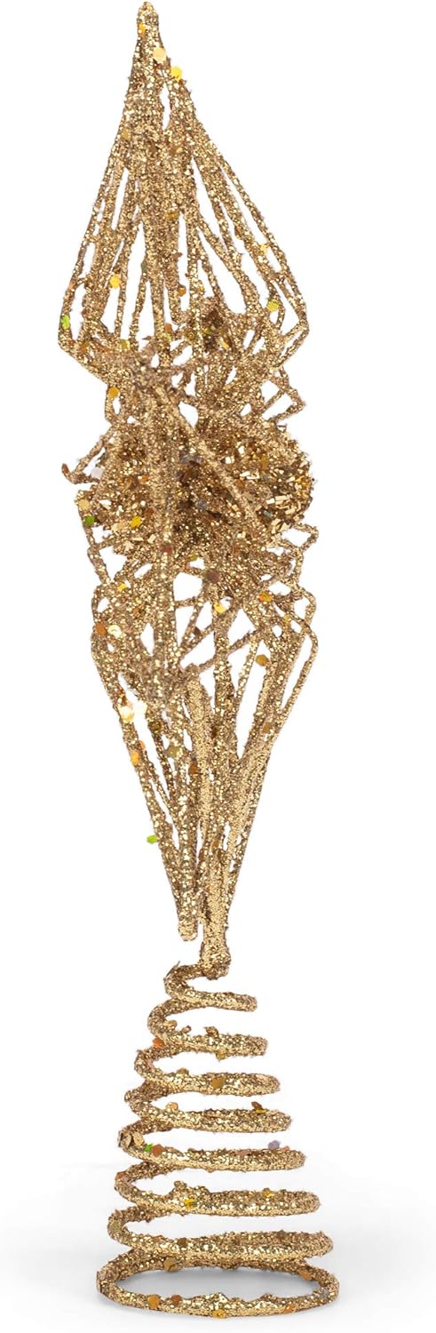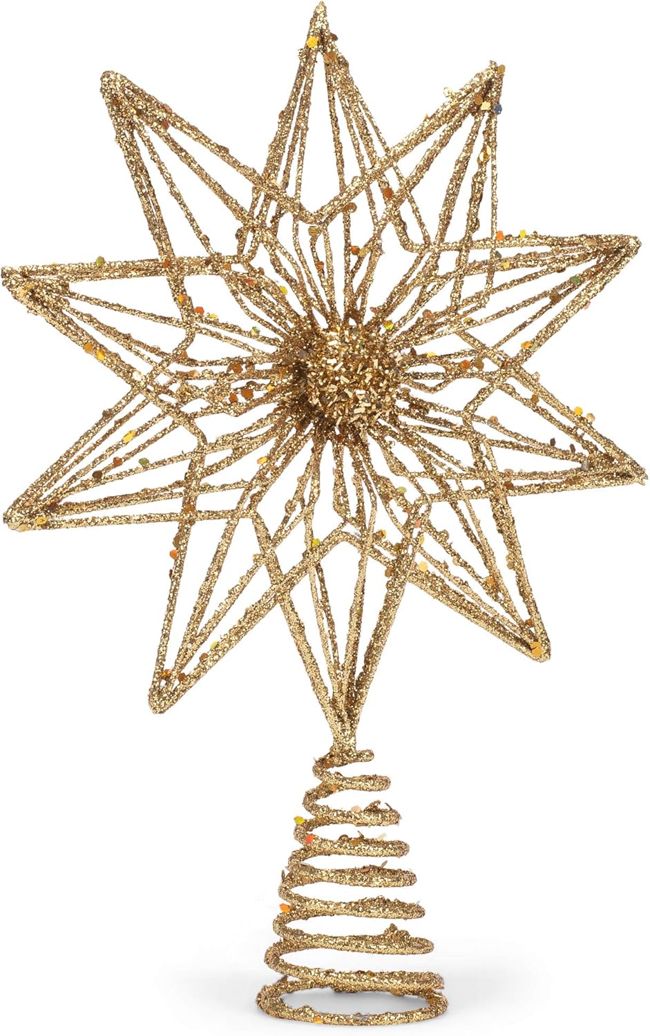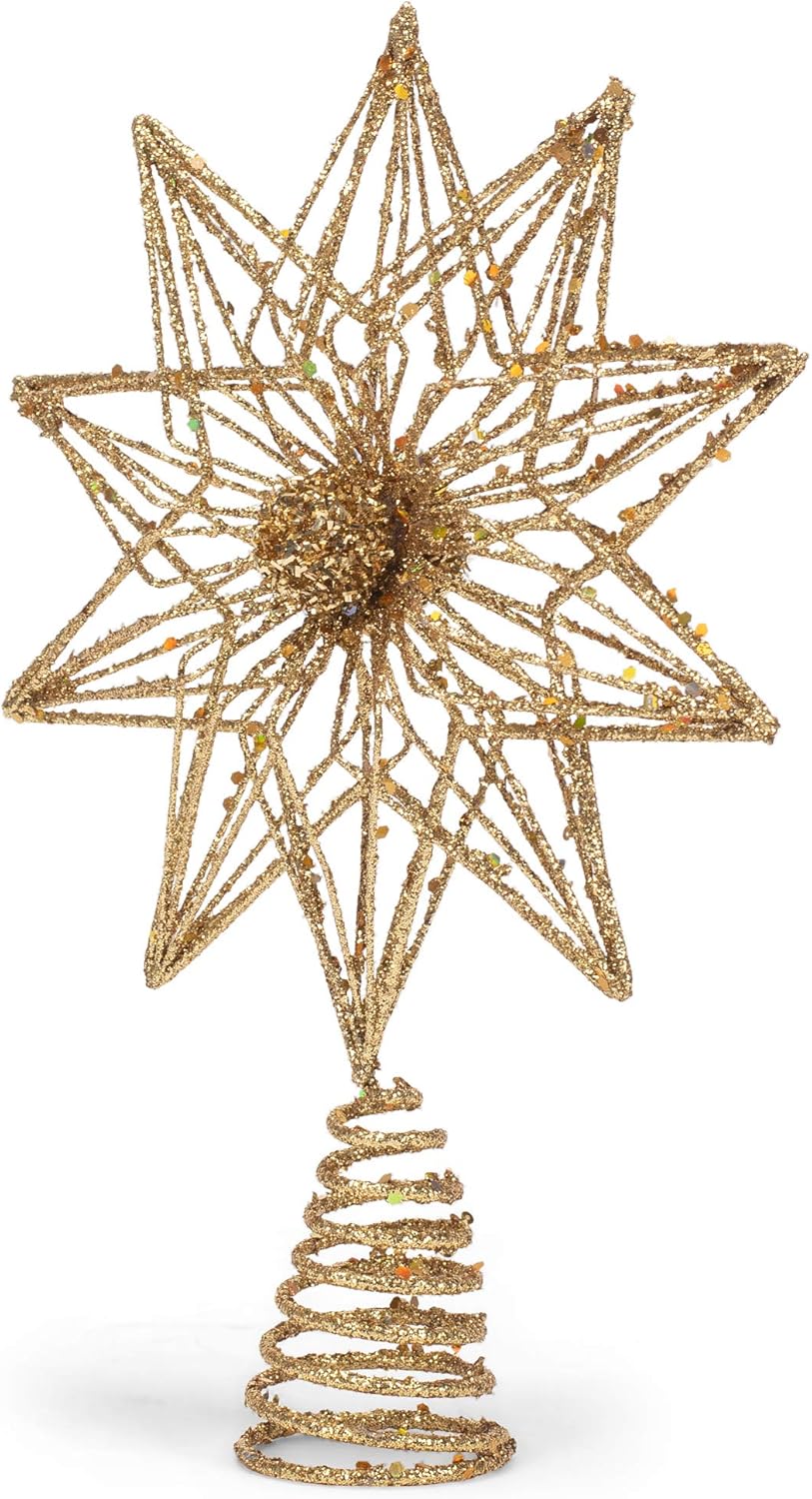 This 12. 5-Inch Gold Glitter Polygonal Star Treetop from Kurt Adler features an intricate golden glittered design. This treetop attaches securely to your tree with its coil base.