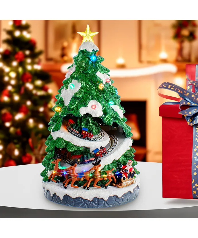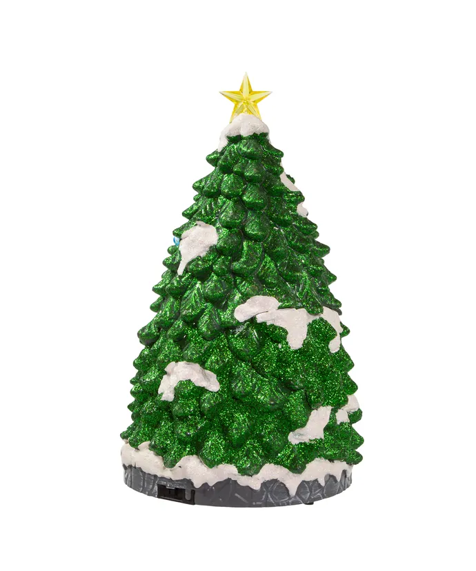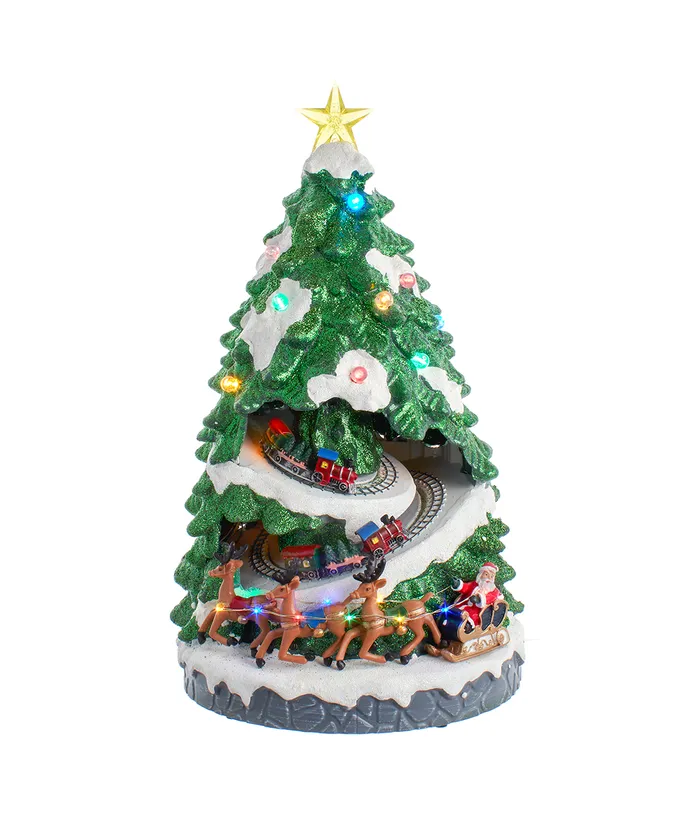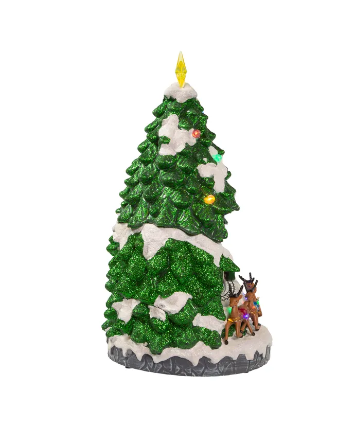 Kurt Adler’s 15.7″ battery lighted musical Christmas tree is a festive addition to any home or holiday décor. The green glittered Christmas tree features white glittered snowcaps and a lighted star treetop. When switched on, the train moves, Christmas tunes play and multicolor LED lights illuminate the tree and reindeer.