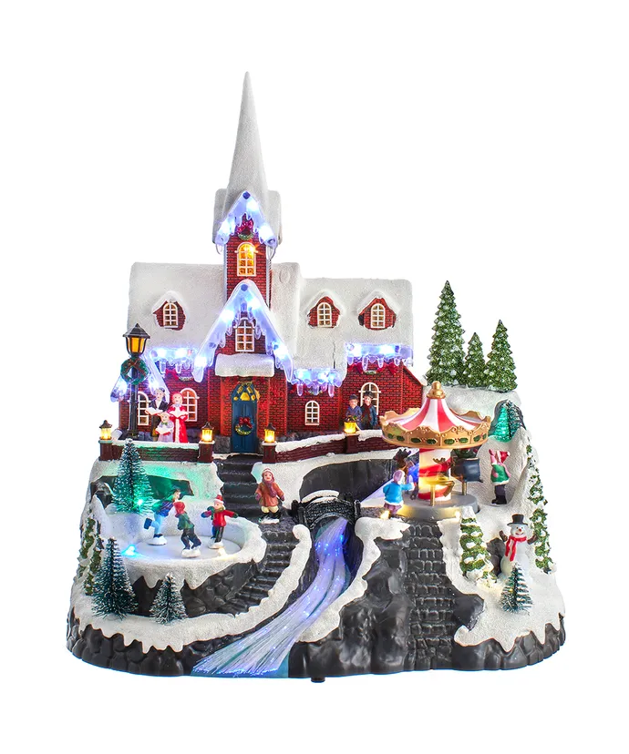 This 15″ lighted musical church is a festive addition to any home or office holiday décor. It features a lighted red church with lighted trees, carousel and path lights. When switched on Christmas tunes play, cool white and multicolor LED lights light up the scene and the carousel rotates and the ice skaters move.