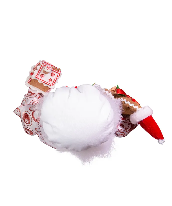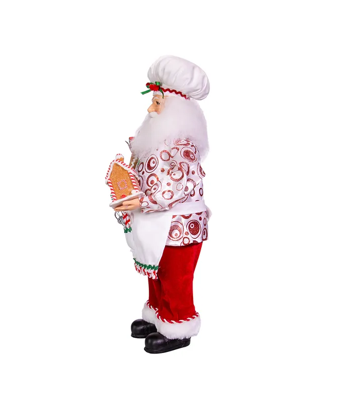This 17-inch Kringle Klaus Gingerbread Chef Santa from Kurt Adler is a fun and festive addition to any holiday decor- Part of the Kringle Klaus collection Santa is featured here wearing a white apron with red and white peppermint trim ready to show off his baking creations- In one hand is a decorated gingerbread house and in his other hand is a gingerbread man wearing a red and white Santa hat-