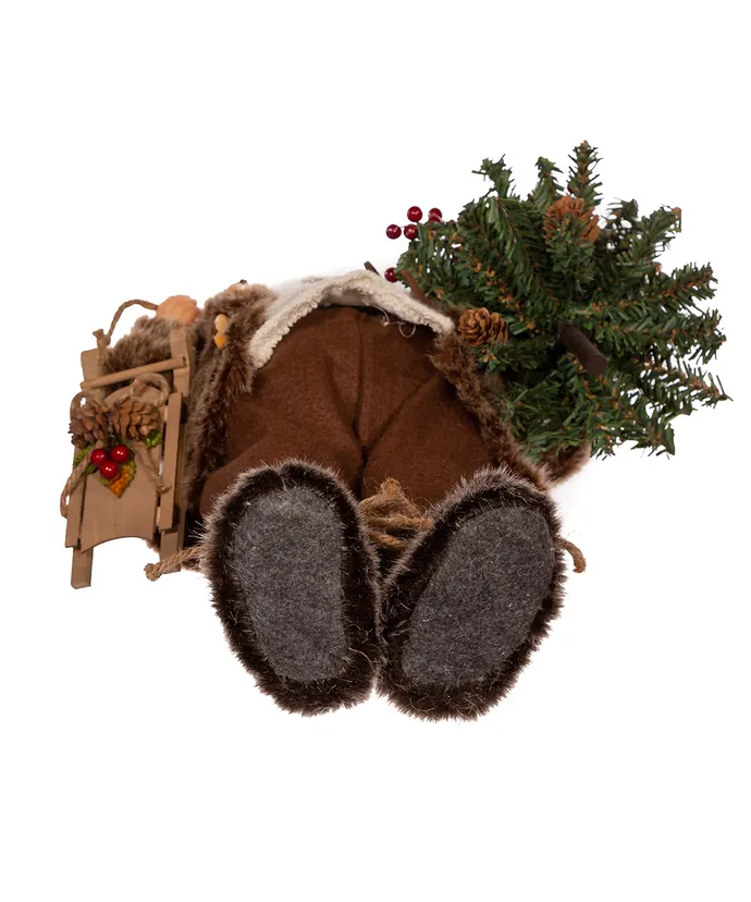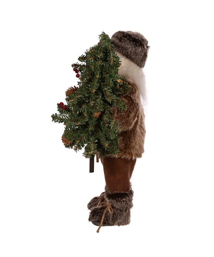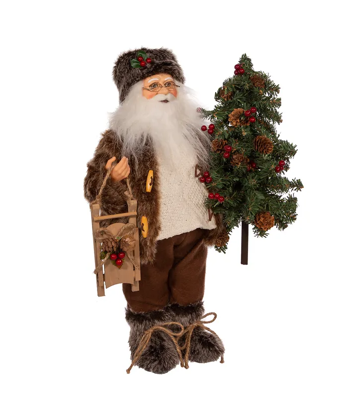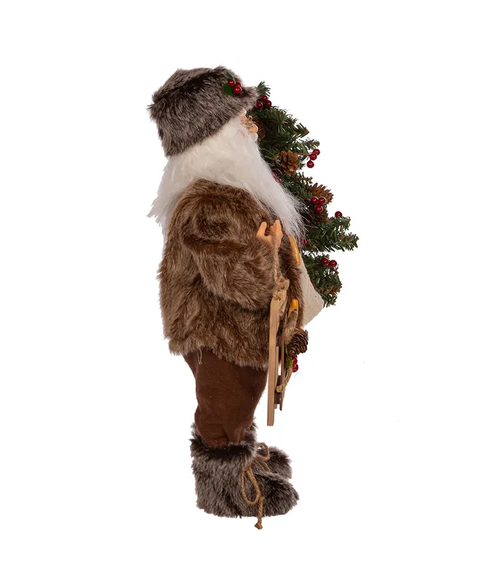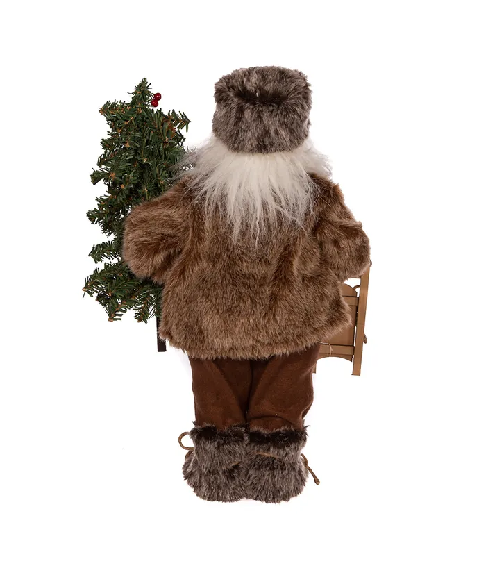 This 17 inch Kringle Klaus Woodland Santa from Kurt Adler is a fun and festive addition to any holiday decor- Part of the Kringle Klaus collection Santa is featured here wearing a woodland inspired outfit with brown and white fur boots and hat- In one hand is a miniature sled and in the other hand he is holding a miniature decorated Christmas tree-