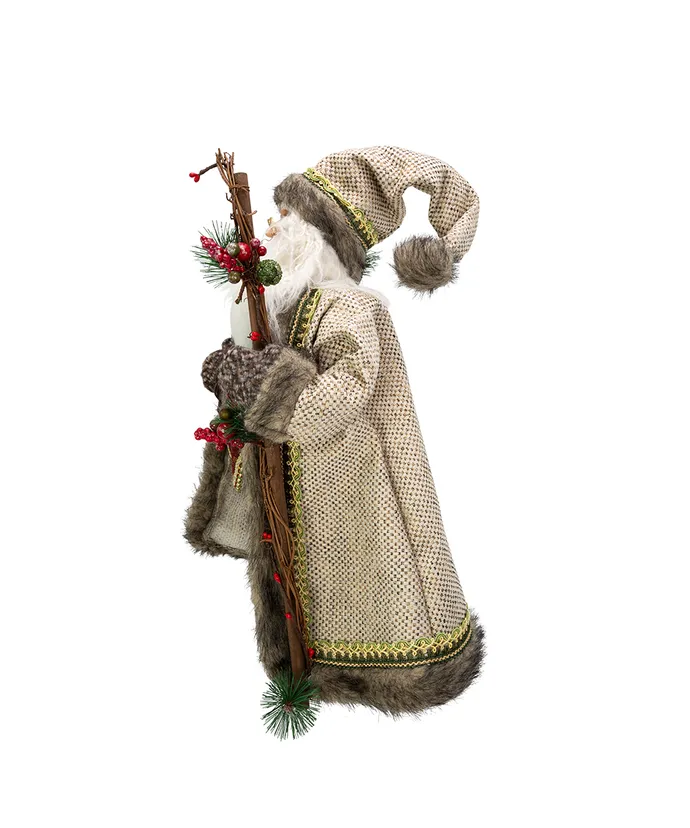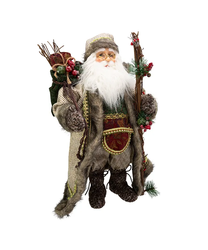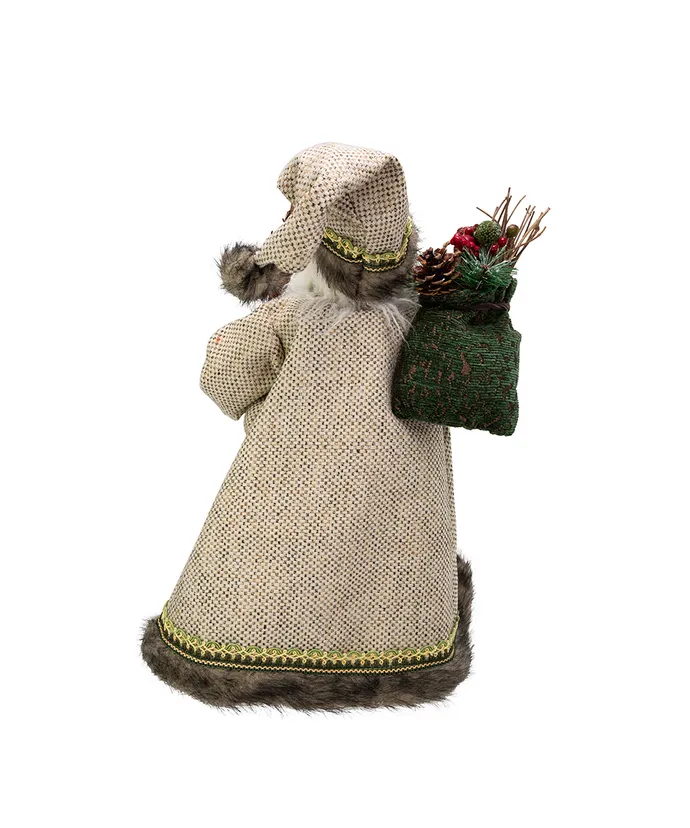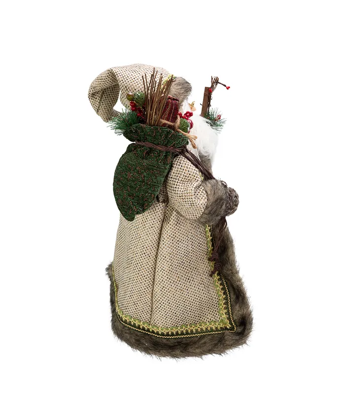 This 18-inch Kringle Klaus Forest Santa from Kurt Adler is a fun and festive addition to any holiday decor- Part of the Kringle Klaus collection this Santa Claus is wearing a grey hat and coat both trimmed with dark grey faux fur- He has a holly-adorned staff in one hand and a large sack flung over his back and held with his other hand-