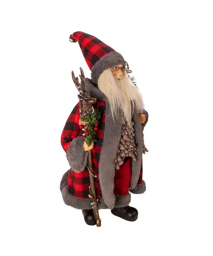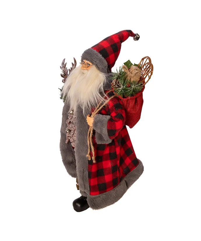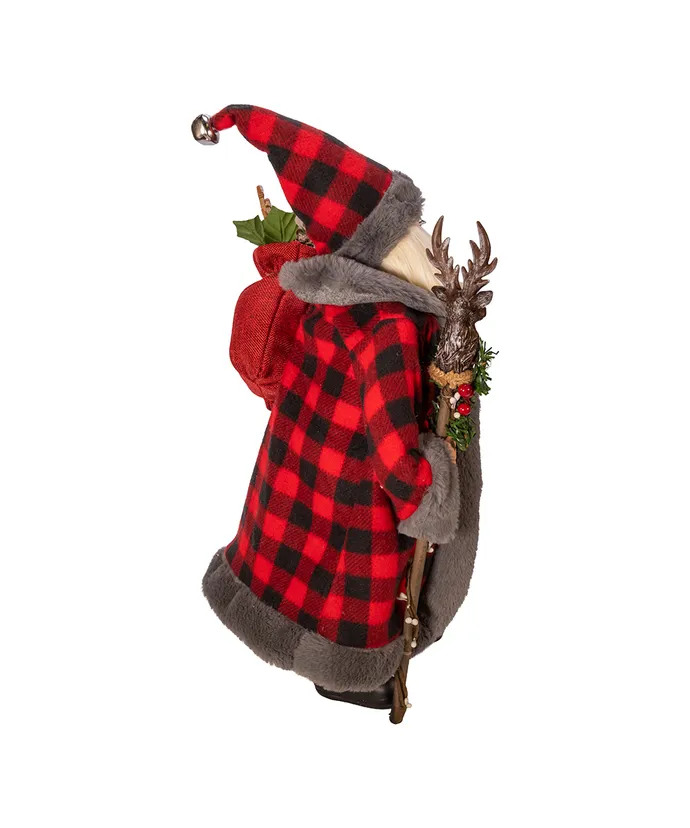 This 18-inch Kringle Klaus Red and Gray Santa from Kurt Adler is a fun and festive addition to any holiday decor- Part of the Kringle Klaus collection Santa is featured here wearing a plaid red and black robe with grey fur trim and matching hat- In one hand is a holly berry staff and in his other hand is a sack filled with Christmas decor-