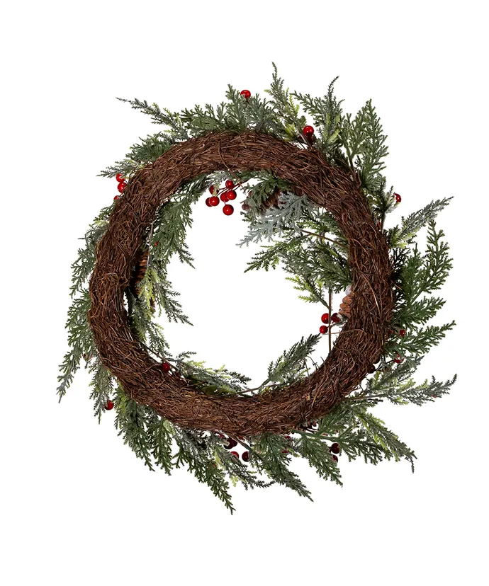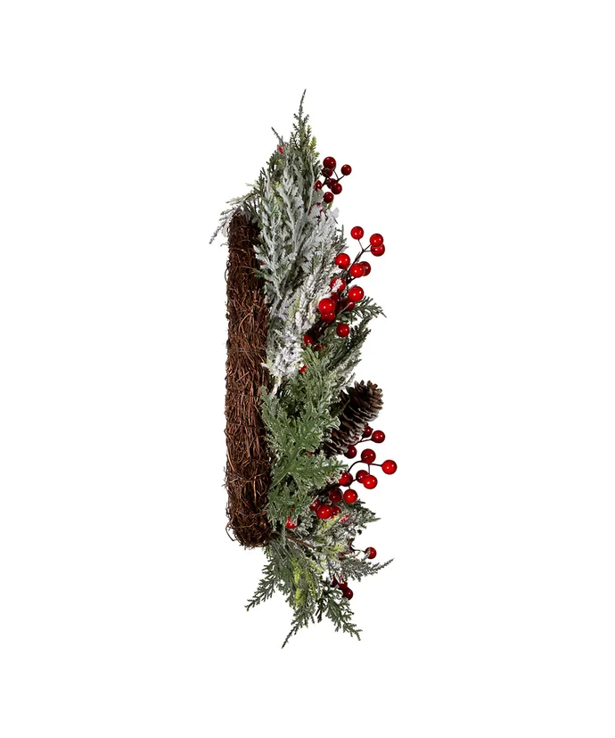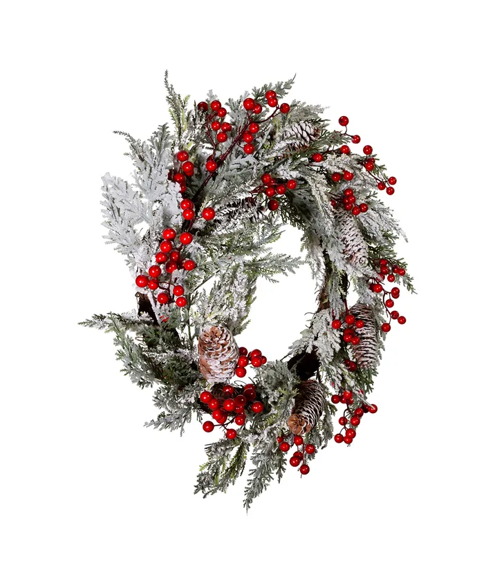 This Un-Lit flocked rattan wreath from Kurt Adler is a beautiful way to add to any holiday décor. The flocked wreath is decorated with red berries and pinecones.