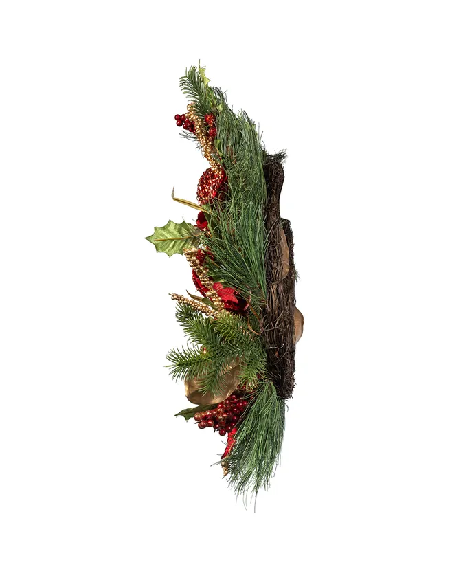 This 24″ Unlit Gold & Red Poinsettia Wreath from Kurt Adler is a stunning and festive holiday decoration that adds a touch of elegance and seasonal charm to your home. This wreath features a classic combination of red poinsettia blooms with red glitter accents and gold leaf and berry accents, creating a warm and inviting atmosphere. Poinsettias are iconic symbols of the holiday season and add a touch of traditional beauty to your decor. Crafted to resemble a natural wreath, this decoration features detailed foliage and blooms that capture the essence of a festive holiday wreath. With a diameter of 24 inches, this wreath is a versatile size that can be hung on your front door, above your fireplace, in windows, or on any wall that could use a dose of holiday cheer. This wreath is unlit, allowing you to add your preferred string lights or other decorative lighting to create a warm and inviting glow. The combination of gold and red is a classic and timeless choice for holiday decor, making this wreath suitable for a wide range of decorating styles. In addition to hanging on your front door, this wreath can be used as a centerpiece for your holiday table, as part of a festive vignette, or as an accent in various rooms. Unlike fresh wreaths, this artificial wreath can be enjoyed year after year, making it a sustainable and eco-friendly choice for holiday decorating. It is a timeless and festive addition to your holiday decor. Its classic color scheme and lifelike poinsettia blooms create a warm and welcoming atmosphere in your home. Read more