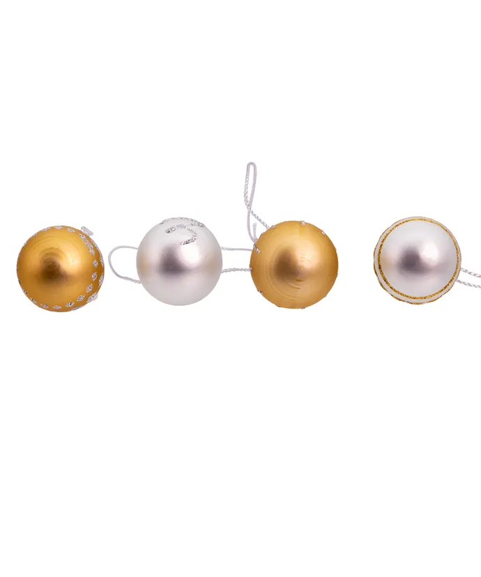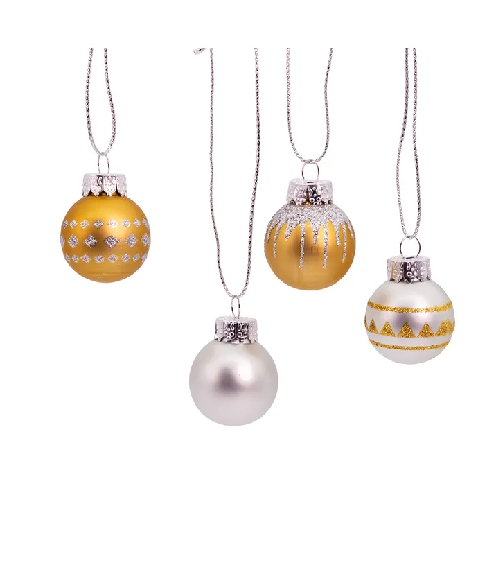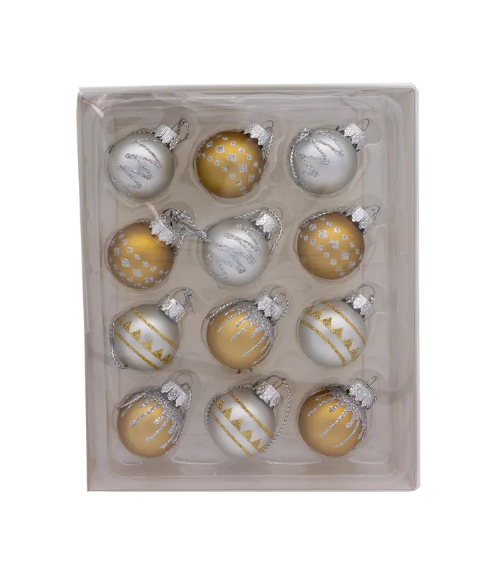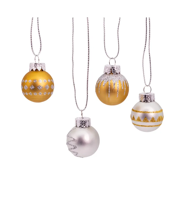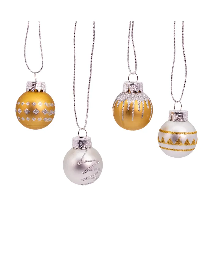 These Kurt Adler gold and silver decorated miniature glass ball ornaments are the perfect way to add some shimmer to any holiday décor or Christmas tree. Each of box comes with 12 miniature ball ornaments in gold and silver with glittered accents. The ornaments in this 12-piece box feature 6 gold ball ornaments with a silver glittered pattern and 6 silver ball ornaments with a gold glittered design.