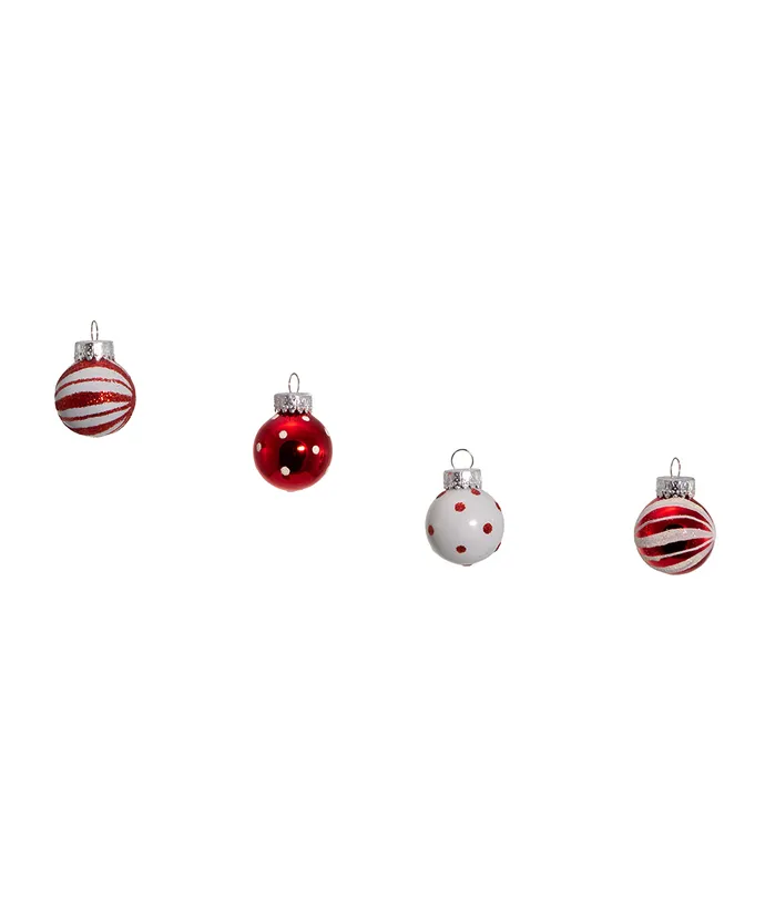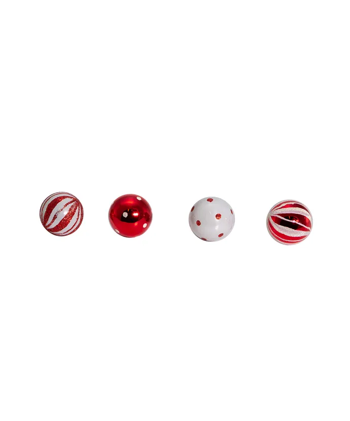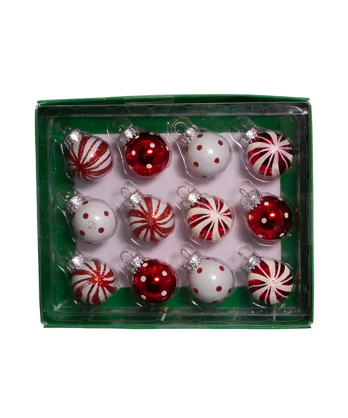 These red and white glass ball ornaments by Kurt Adler are a charming addition to any holiday decor or Christmas tree. This set includes white with red polka dots, red with white peppermint swirls, red with white polka dots, and white with red peppermint swirls, all embellished with glitter.