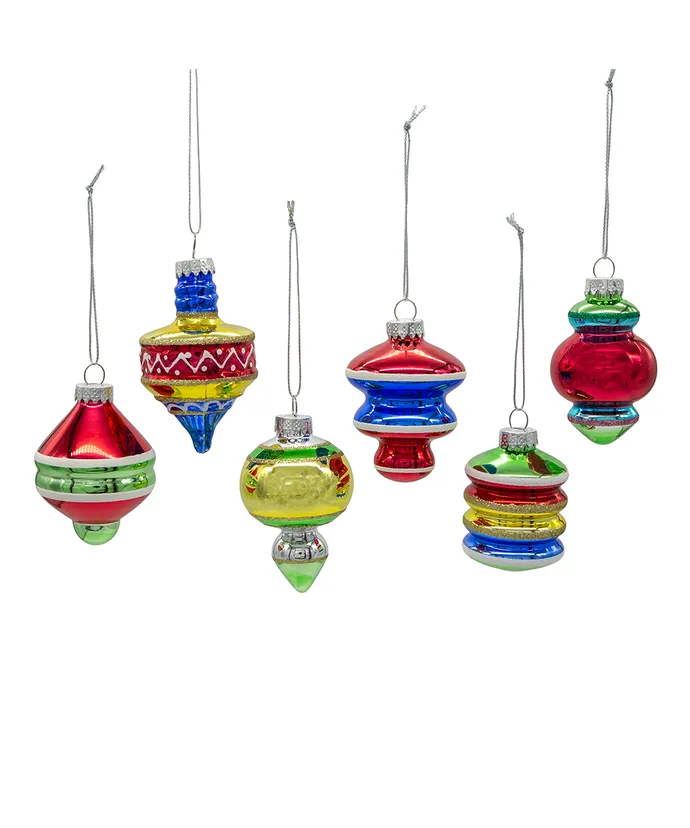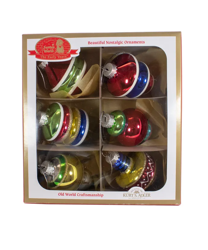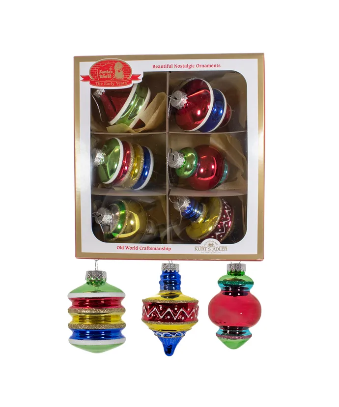This 3.5-Inch Glass Early Years Finial 6-Piece Ornament Set is part of the Kurt Adler Early Years collection, which is comprised of vintage-style tree ornaments and other items of holiday décor that have all the old-world nostalgic charm that you remember from years gone by. Each finial shaped ornament in this 6-piece set measures approximately 3.5″ and is accented with a colorful painted ring design and glitter.