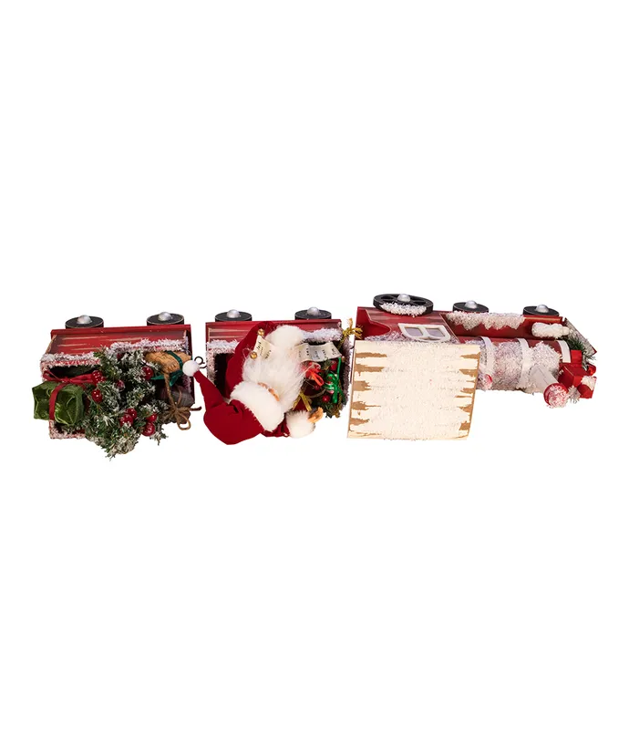 This 30-5-inch Kringle Klaus Santa On Train from Kurt Adler is a fun and festive addition to any holiday decor- Part of the Kringle Klaus collection Santa is featured sitting in a train set wearing his traditional red and white coat and hat- The train set includes a decorated wreath in front of the locomotive and two passenger cars- Each car is filled with presents and Christmas decor-