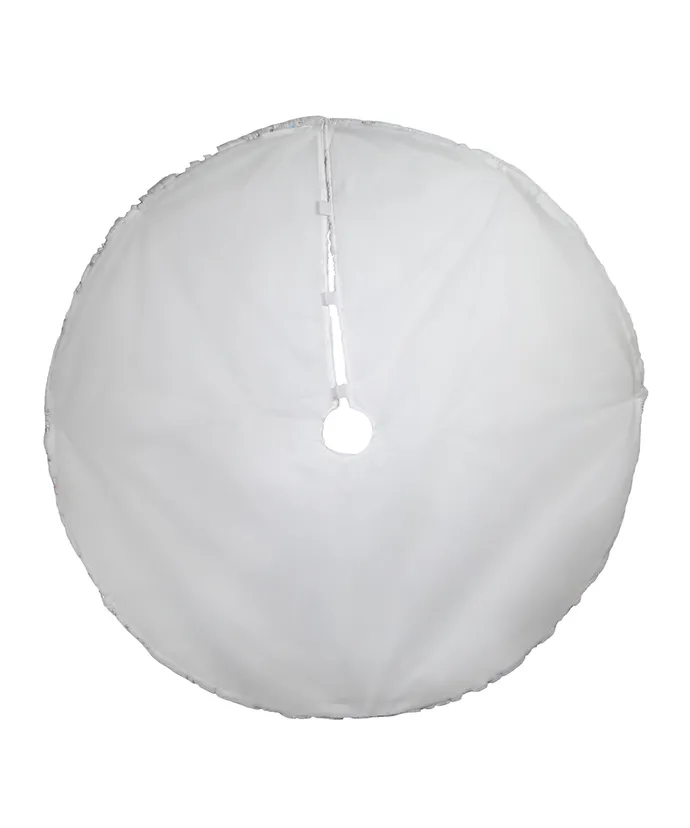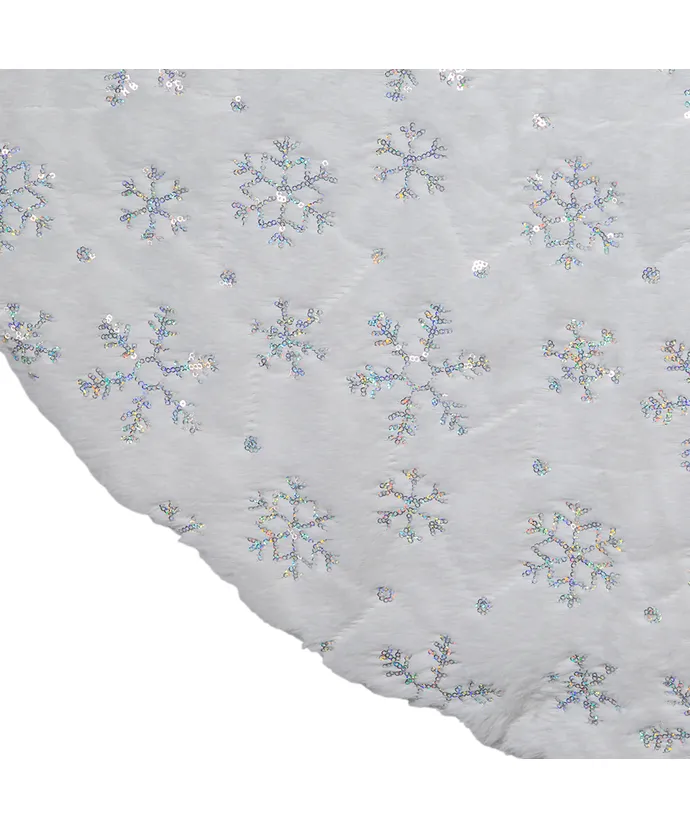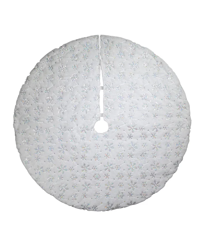 This 48-inch white with sequined snowflake tree skirt from Kurt Adler is a fun and festive addition to any holiday décor. It features a white tree skirt with a sequined snowflake pattern and a faux fur border.