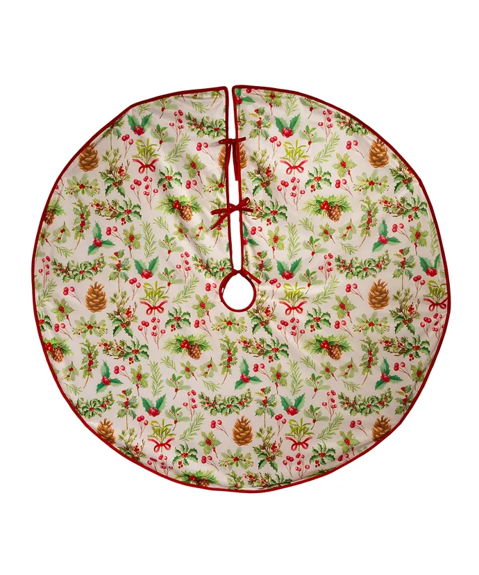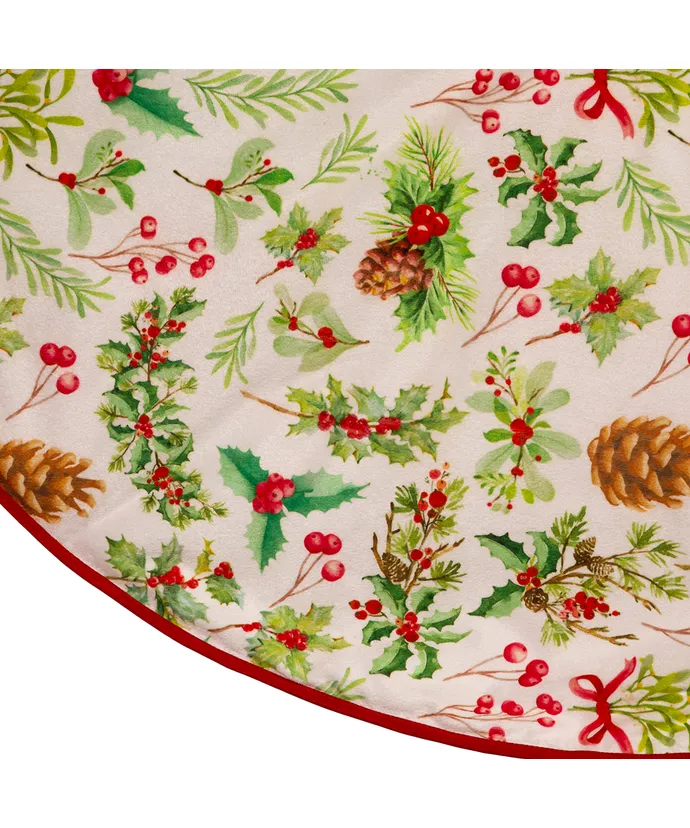 This 50-inch white velvet tree skirt from Kurt Adler is a fun and festive addition to any holiday décor. Its white velvet tree skirt has a multipoint design, including pine cones, holly leaves and red berries, and green fern leaves with a red bow and a red cord border.