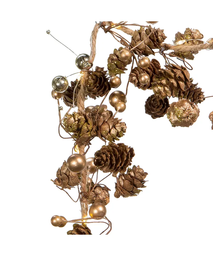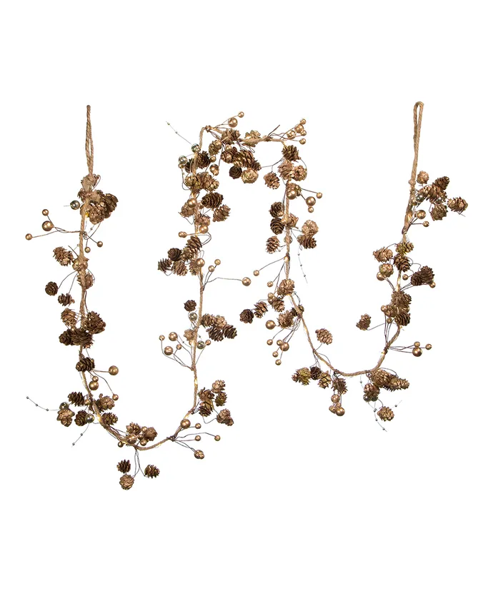 Add a touch of nature to your holiday décor with this battery operated gold berry and pine garland from Kurt Adler. Measuring approximately 6 feet in length, this gold garland is adorned with pine needles, pinecones, and holly berries. Perfect for adding extra Christmas cheer to larger areas of your home.