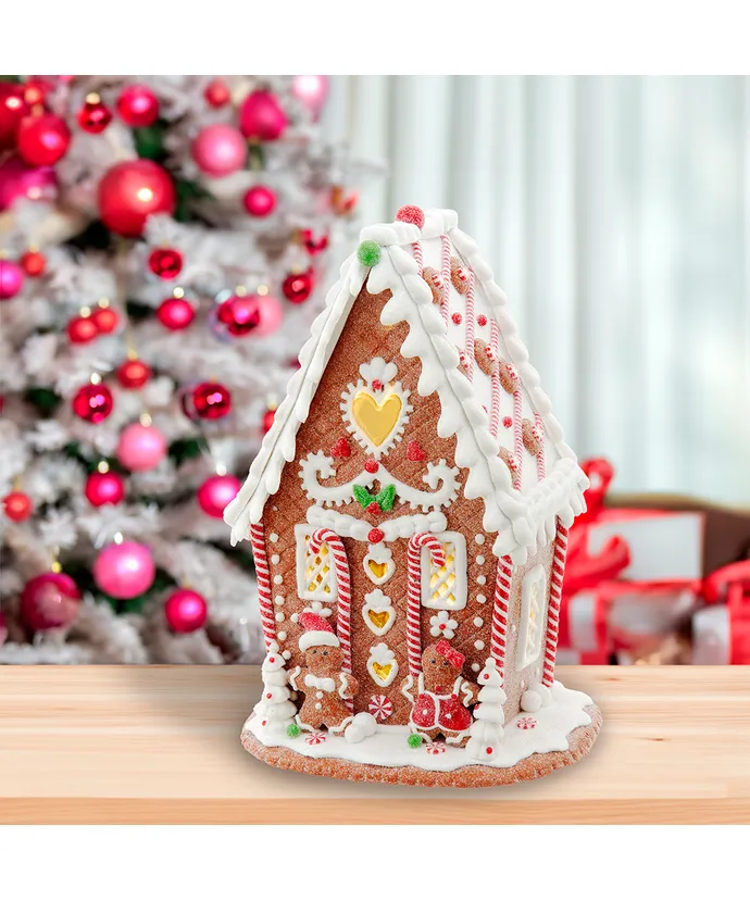 What sets this gingerbread house apart is its built-in LED light, which offers a warm and inviting glow, creating a magical ambiance when illuminated. Operated by batteries, this table piece offers flexibility in placement, allowing it to adorn various spaces without the need for a nearby power source.
