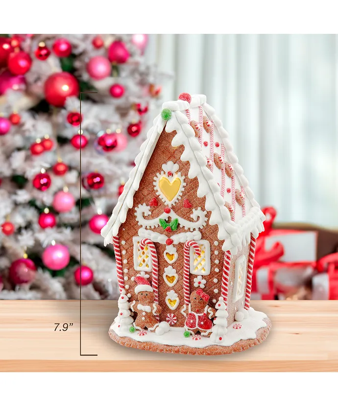The house stands at 7.87 inches tall and is adorned with intricate frosting details, candy cane pillars, and a heartwarming heart embellishment, reminiscent of a classic, storybook gingerbread house.