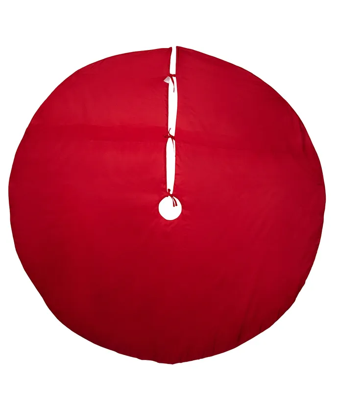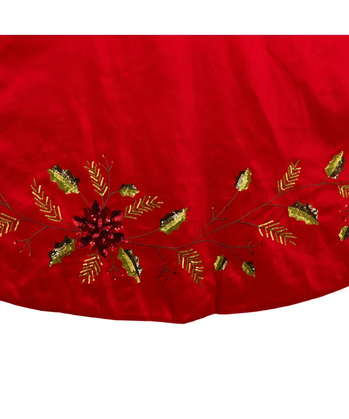 Crafted from rich red dupion fabric, the tree skirt brings warmth and vibrancy to your holiday display. The 72-inch diameter ensures ample coverage for the base of your Christmas tree, providing a visually stunning backdrop for your presents and ornaments. The Multi Sequin Poinsettia and Holly Leaves embellishments elevate the tree skirt to a new level of sophistication.