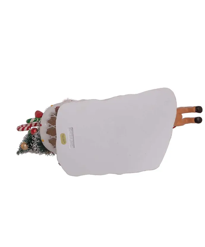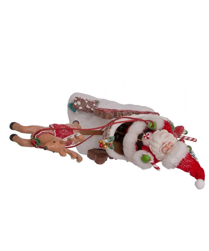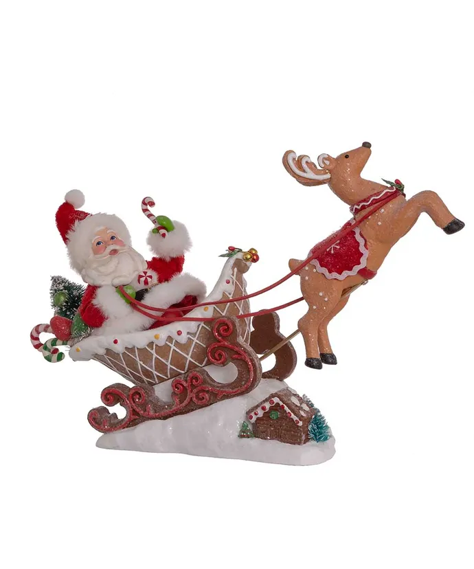 Part of Kurt Adler’s Fabriche collection this 9-75″ gingerbread sleigh Santa is a festive addition to any holiday decor- Santa is riding in a gingerbread sleigh pulled by a glittered reindeer filled with presents and a miniature Christmas tree over a gingerbread house-