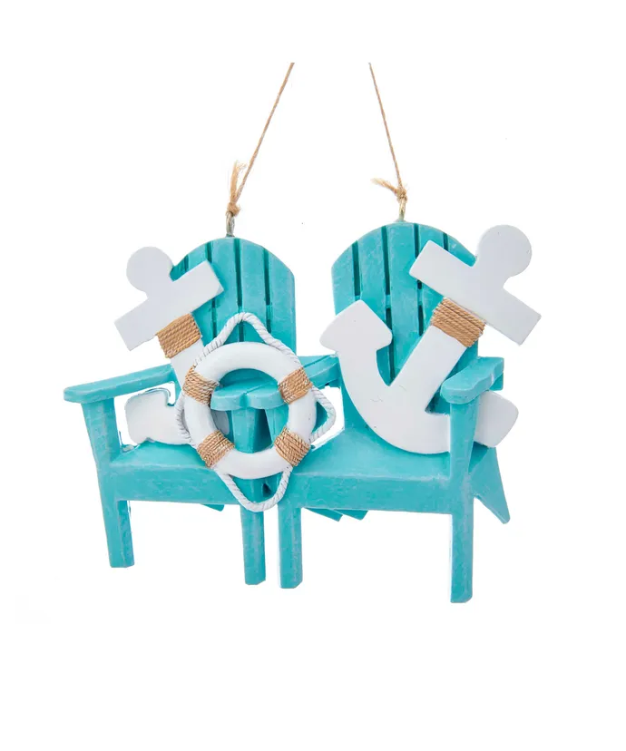 CompareAdd to wishlistThis Kurt Adler couples Adirondack chair with anchor for personalization is a fun addition or any holiday décor or Christmas tree. This ornament features two blue Adirondack chairs, anchors, life preserver and gold cord hangers.