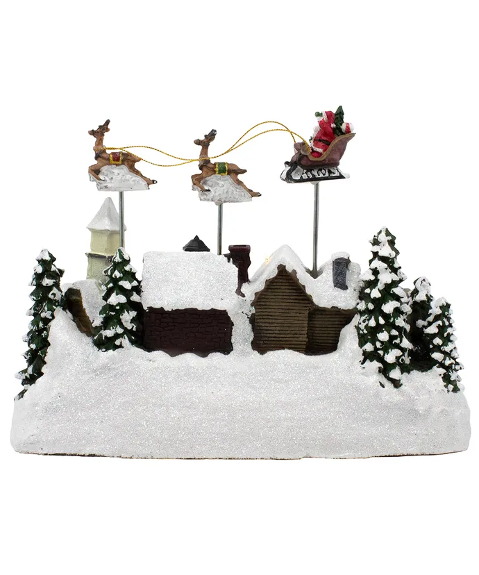 Watch Santa fly over a village with this Kurt Adler musical table piece. This piece features a peaceful row of houses that illuminate from within. In front of the houses there are two carolers and two children playing in the bright white snow. Above this idyllic scene is Santa in his sleigh being pulled by his eight reindeer. When activated, the houses light up, one of eight beloved holiday classics begins to play and Santa’s sleigh moves up and down!