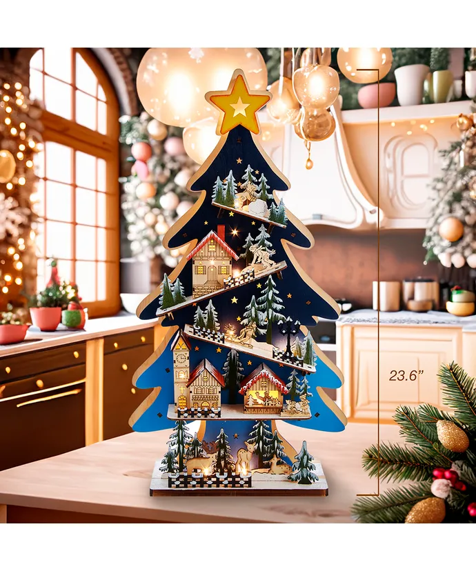 Add a touch of holiday magic to your décor with Kurt Adler’s Battery-Operated Light-Up LED Wooden Christmas Tree with Village Scene. This beautifully crafted wooden tree features a scenic village nestled at its base, complete with glowing LED lights that illuminate the charming houses, snow-covered trees, and festive details. The soft, warm light creates a cozy atmosphere, making it perfect for mantels, tables, or as a focal point in your holiday display. Battery-operated for convenience, this festive piece brings a nostalgic, enchanting vibe to your home, evoking the true spirit of Christmas.