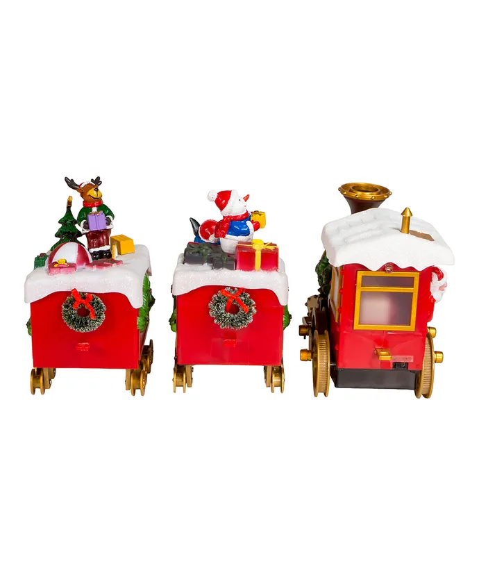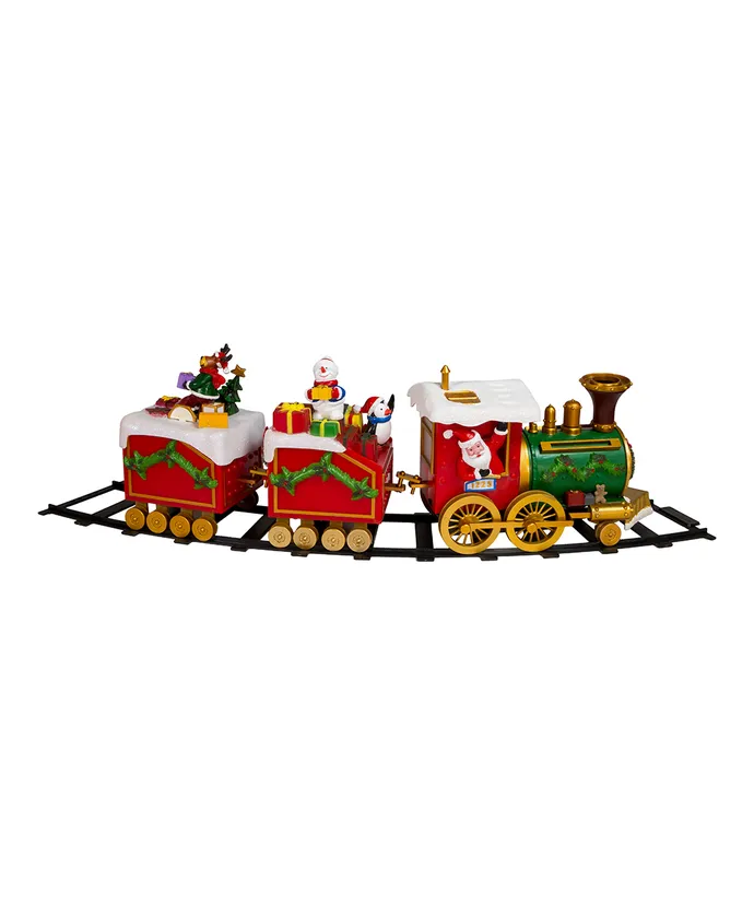 Kurt S. Adler’s 19.7-Inch Battery-Operated Light Up Musical Santa Train Set, 3 Piece Set is a festive addition to any home or office holiday décor. This 3-piece set includes train cars filled with presents and track. When switched on, lights glow and 8 Christmas tunes begin to play.