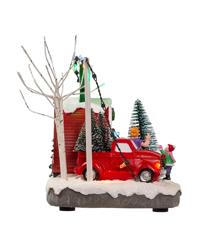 This battery operated lighted “Christmas Tree” shop is a fun and festive addition to any home or office holiday décor. It features a tree shop with a red pick up truck, snowy trees, and a camper on glittered snow. When switched on a strand of 15 LED lights illuminate.