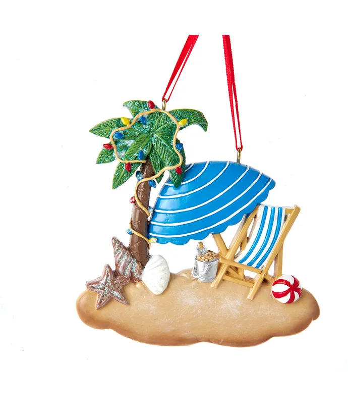 CompareAdd to wishlistKurt Adler’s beach ornament for personalization is festive addition to any holiday décor or Christmas tree. It features a sandy beach with a beach chair and umbrella and a decorated palm tree.
