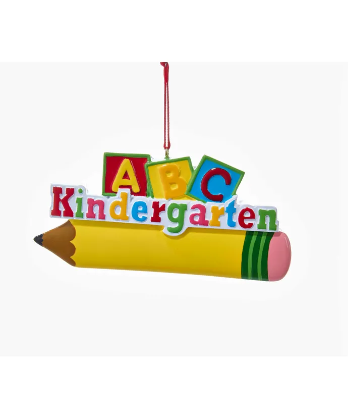This Kindergarten personalization ornament from Kurt Adler is a beautiful addition to any holiday décor or Christmas tree. Features a bright yellow pencil complete with a pointy tip and pink eraser design. Includes intricate details such as, ABC blocks and “Kindergarten” written in colorful letters.