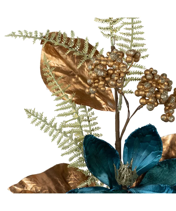 This Magnolia Teal Blue & Copper Spray from Kurt Adler is a striking and elegant decorative accessory that brings a touch of sophistication and natural beauty to your home or special occasions. This unique spray is designed to capture the beauty of magnolia blossoms in a captivating color palette of teal blue and copper, creating a visually stunning and harmonious combination.