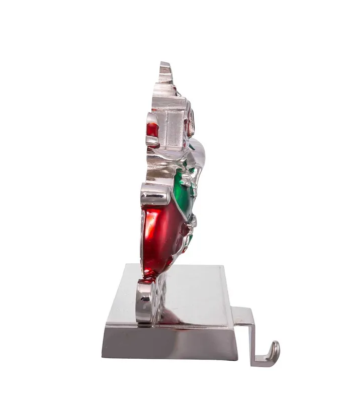Hang your stocking by the chimney in style! This all-metal Stocking Hanger features an elegant winter sleigh design in a green, red and silver color scheme, complete with red and silver presents and a green decorated Christmas tree.