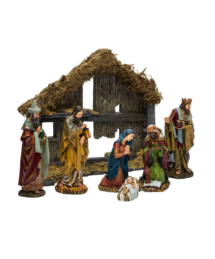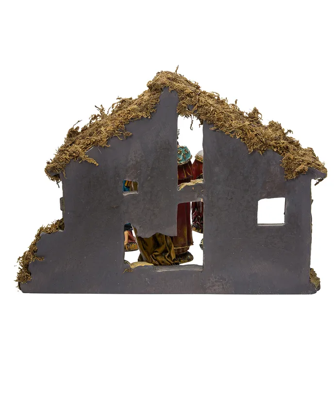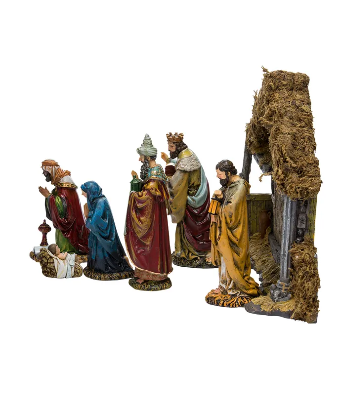 This seven piece set includes a large stable adorned with realistic straw detailing, and 6 stationary figurines: the Holy Family (3), and the Three Wise Men. The stable serves as a beautifully simple backdrop for the six richly-colored painted figurines.