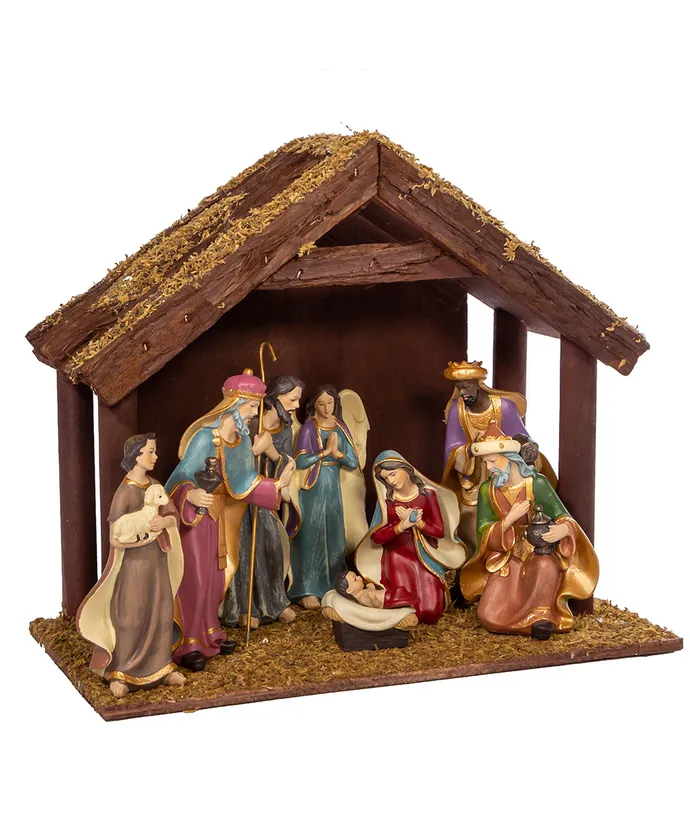 This nativity set includes Mary, Baby Jesus, Joseph, the Three Wise Men, a shepherd holding a sheep and stable.