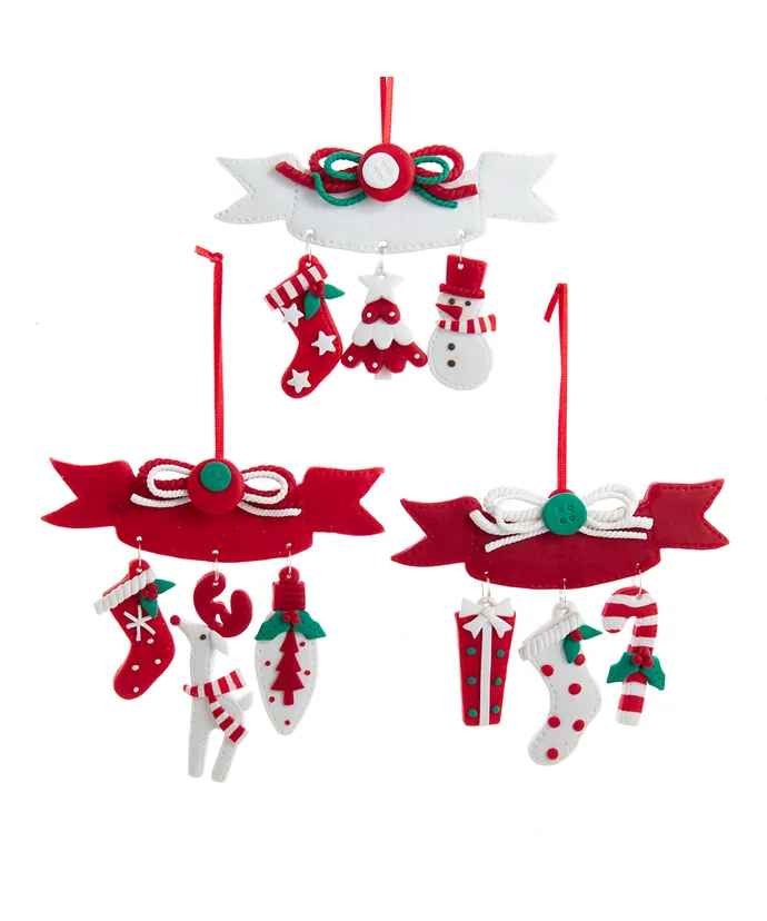 Kurt Adler’s red and white dangle ornaments are a charming addition to any holiday décor or Christmas tree. This assortment feathers a white banner decorated with red and white Christmas dangle and two red banners, each with red and white Christmas dangles. Each of these ornaments can be written on for personalization.