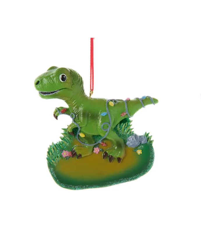 This T-Rex dinosaur ornament from Kurt Adler is a fun addition to any holiday décor or Christmas tree. It features a sweet T-Red entangled in a strand of Christmas lights. He is standing on a glittered patch of grass that can be personalized.