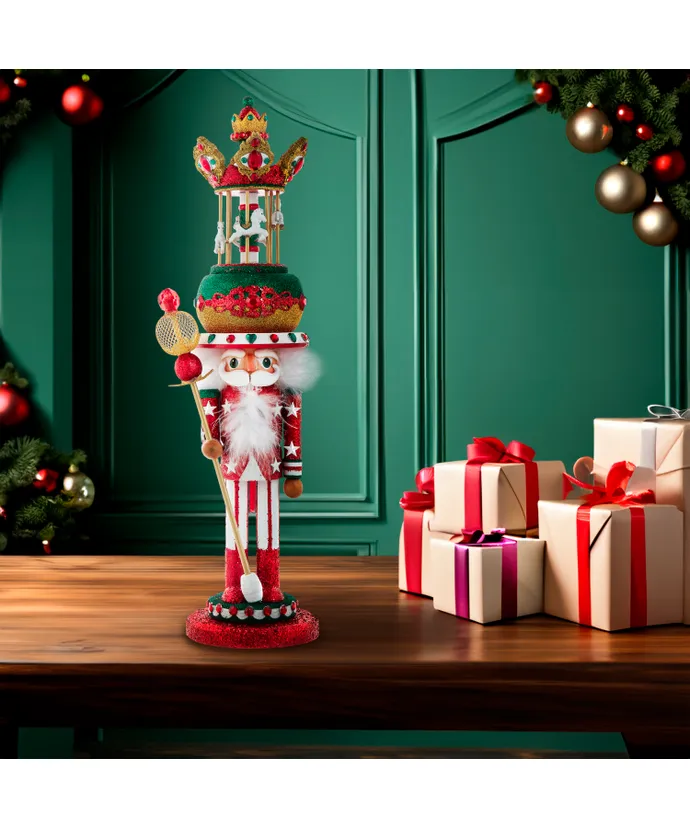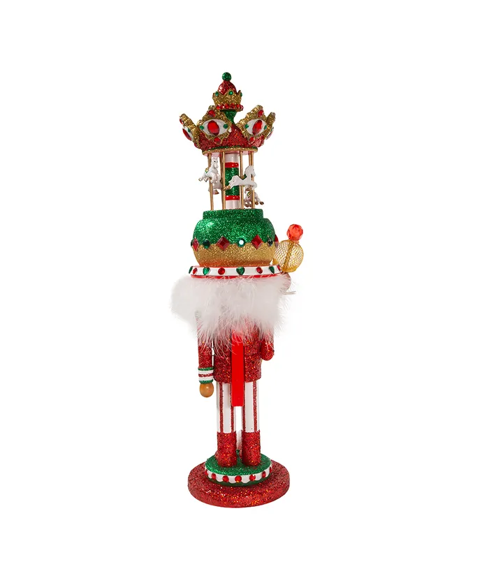 Hollywood Nutcrackers™ is a whimsical collection of nutcrackers created exclusively for Kurt S. Adler, Inc. and features an assortment of designs that put a unique, vibrant, memorable twist on traditional nutcrackers. This 15-inch Musical Carousel Hat Nutcracker is a fun and festive addition to any home or office holiday décor. Dressed in a red and white glittered suite, he is holding a red and gold glittered staff and standing on a matching glittered base decorated with red gemstone accents. His carousel hat is beautifully decorated with red, green and gold glitter and red gemstones. Each white horse has a matching saddle and gold glittered hoofs.