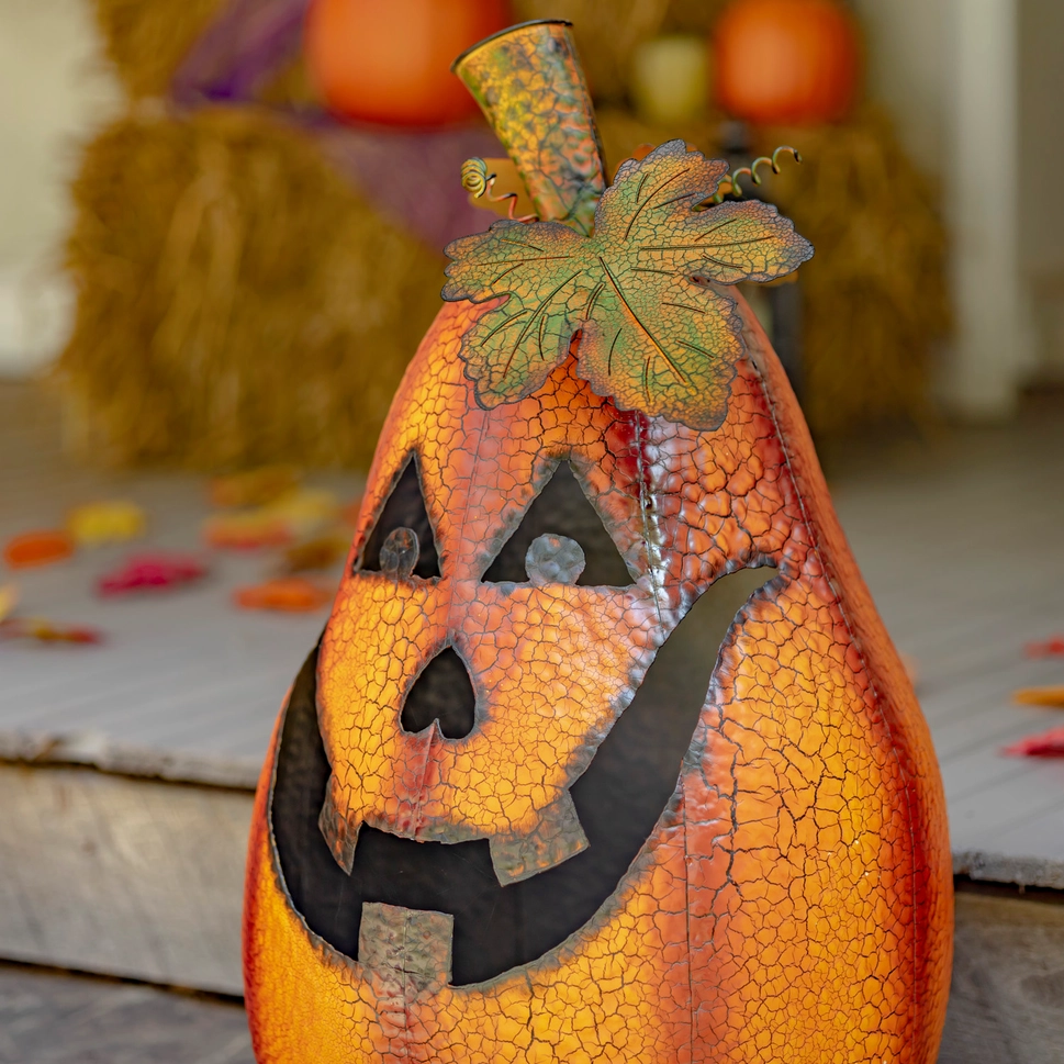 Well, that’s no longer an issue with “Laird Pump”, our new Large Metal Jack-O-Lantern with Candleholder. This decoration is two and a half feet tall, crafted from solid iron and hand painted for a realistic, distressed look.