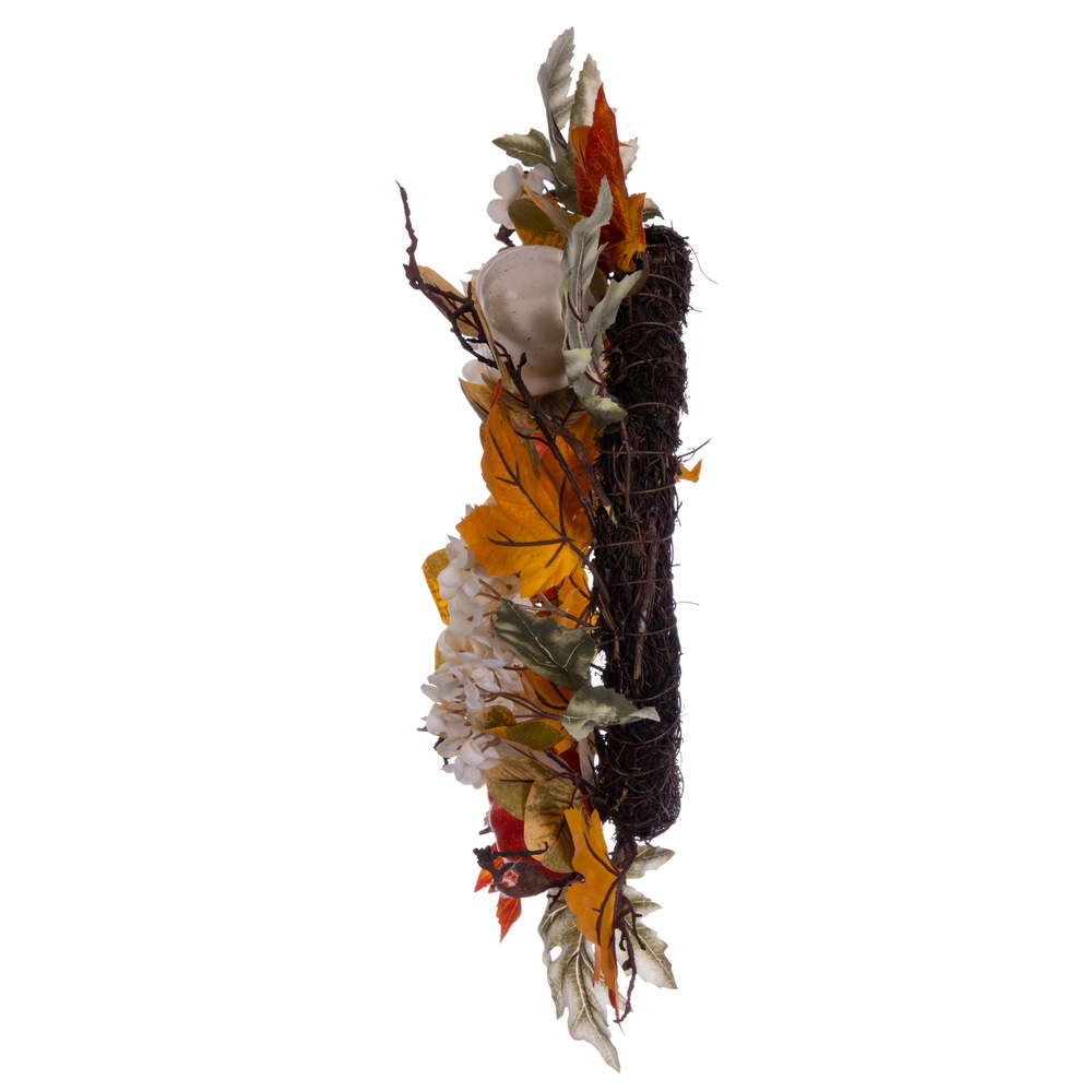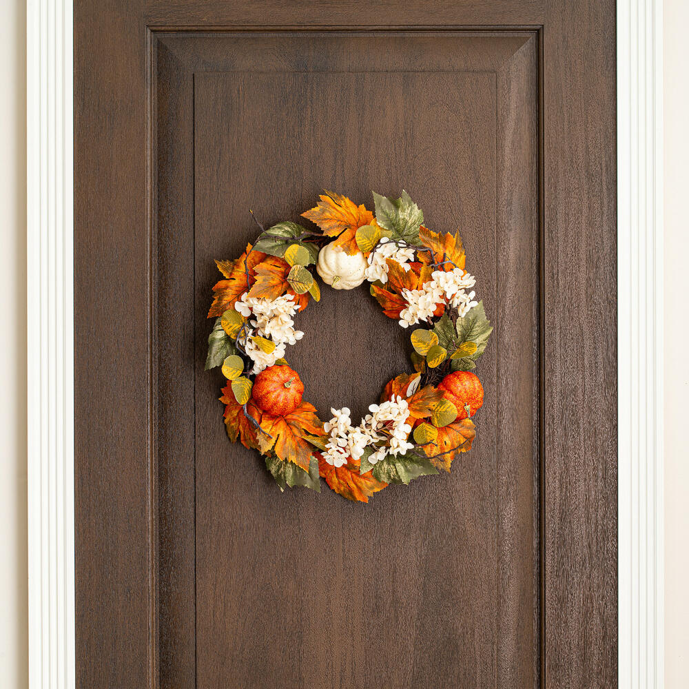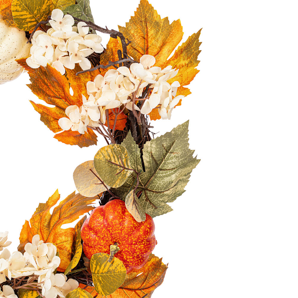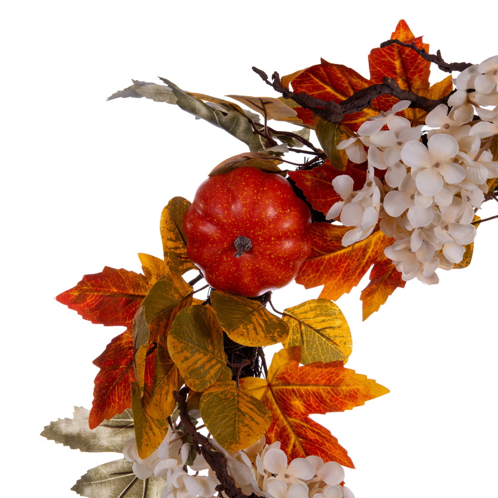 Vickerman Artificial 22″ Orange Fall Pumpkin Hydrangea Wreath. Features pumpkins, leaves, and hygrangeas in an orange and white color scheme, on a circular grapevine base.