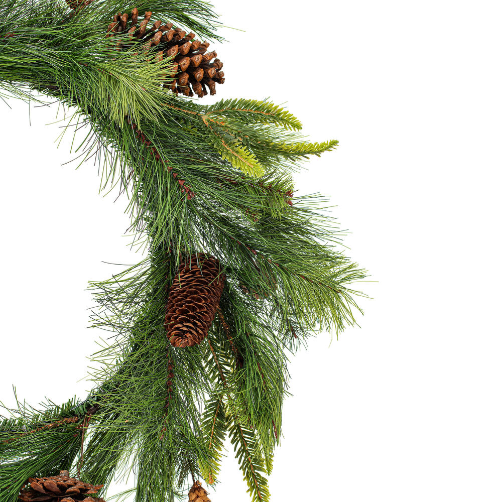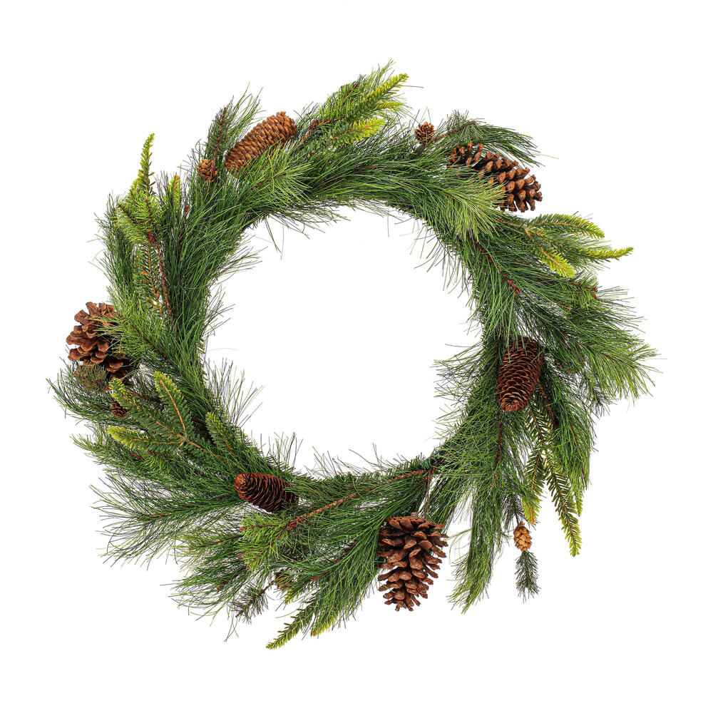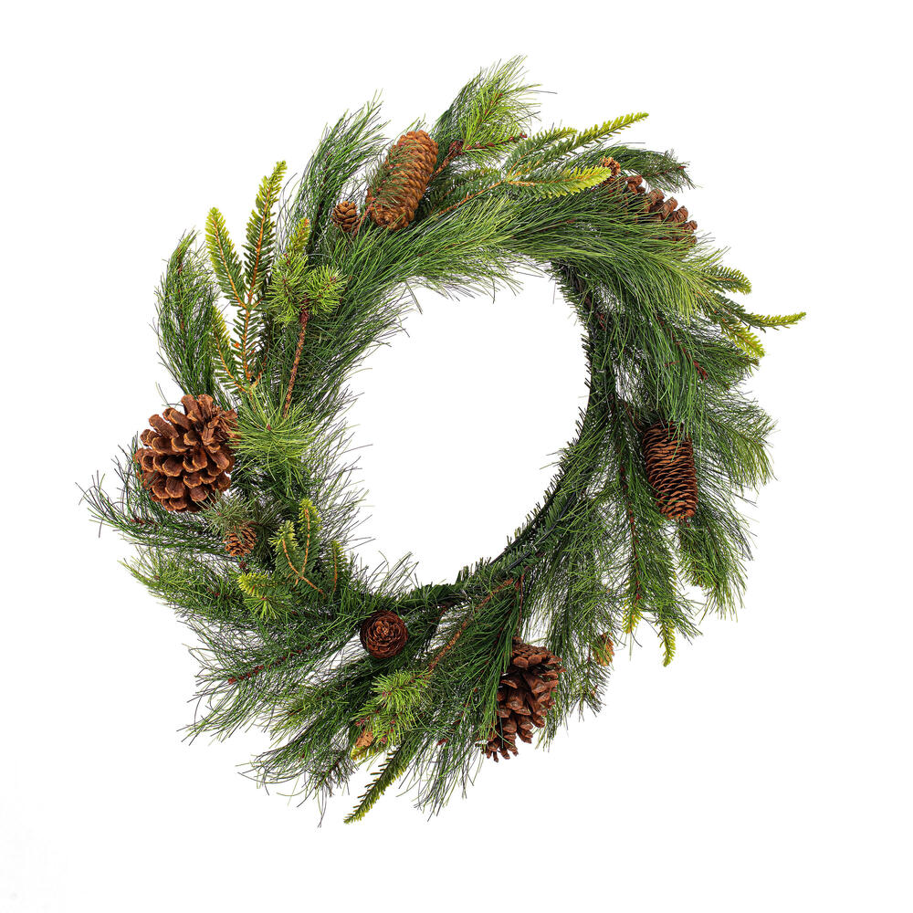 Vickerman 24″ Artificial Green Mixed Pine with Pinecone Wreath. It measures 24 inches in length from end to end.